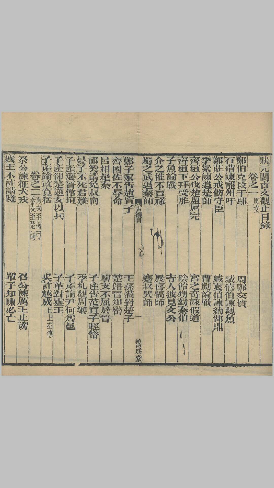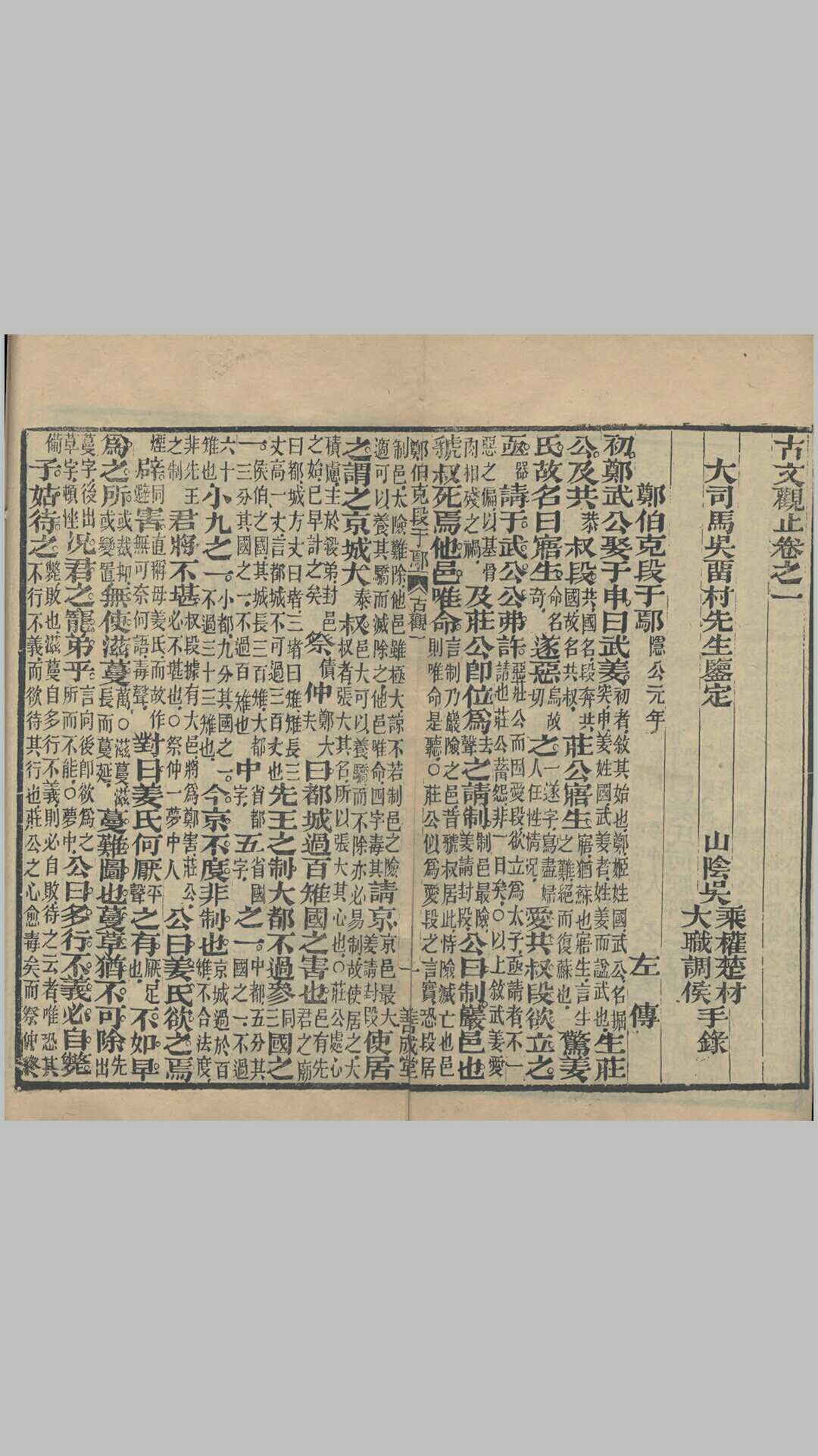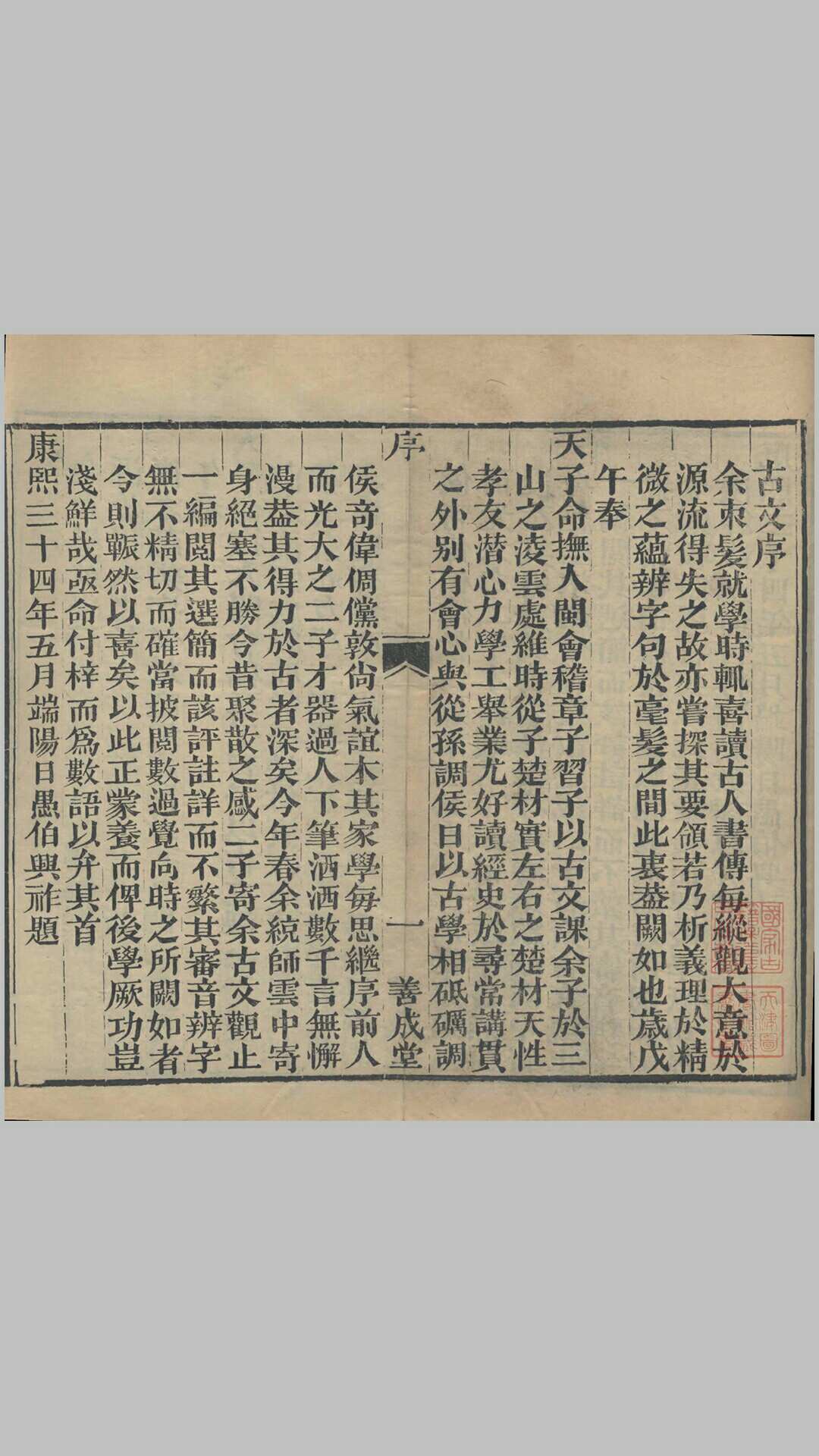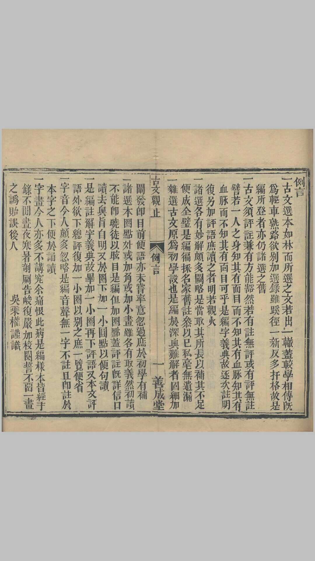 《古文观止》是清代吴楚材、吴调侯于康熙三十三年(1694年)选定的古代散文选本。该书是清朝康熙年间选编的一部供学塾使用的文学读本,此书是为学生编的教材,康熙三十四年(1695年)正式镌版印刷。