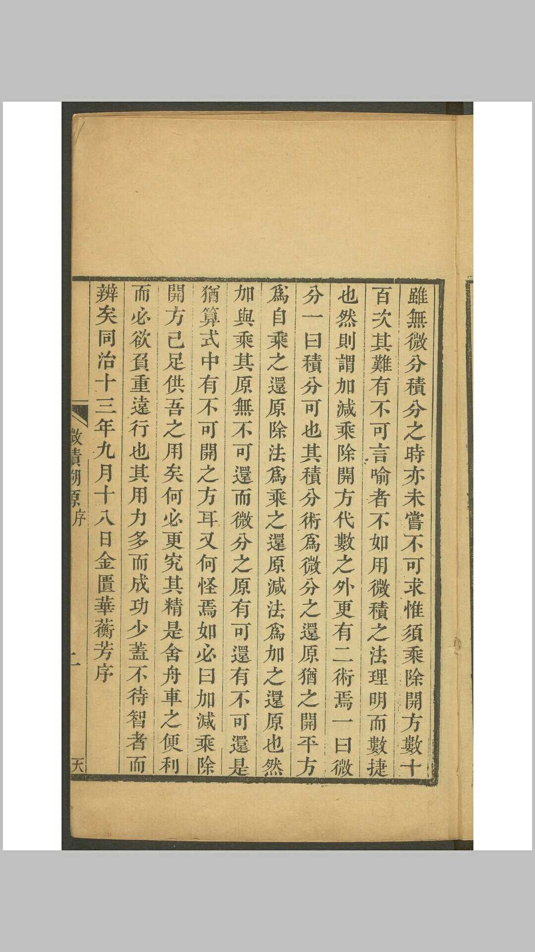 八卷。英国华里司 撰。清华蘅芳与英国傅兰雅(详见《数学理》)合译。这是第二部被译成中文的系统微积分著作。
