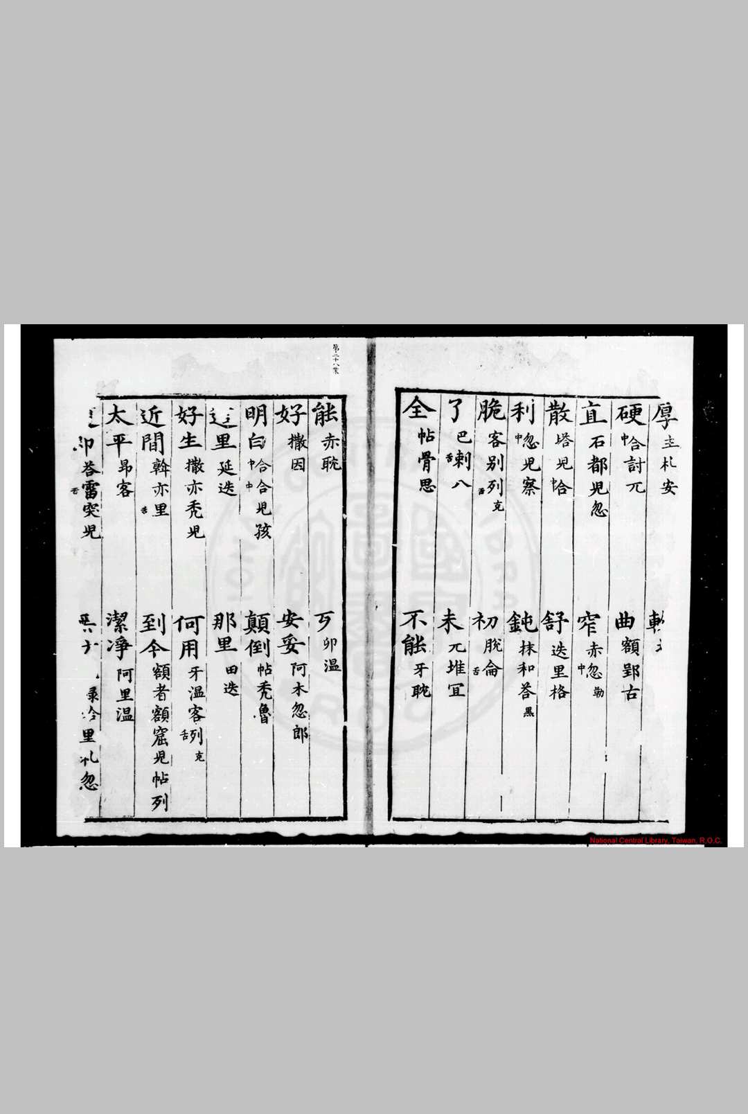 书中各语种均由四译馆和有关各省督抚采录。汉字墨笔楷书,番、夷字依形体特点或行或楷。半页分右上、左上、右下、左下横写四组单词,唯《西天真实名经》和《僰夷译语》竖写。每组3行,第1行是本字(词),第2行是字义,第3行是发音。字义和发音用汉字注。行距疏朗,字体清晰典雅。