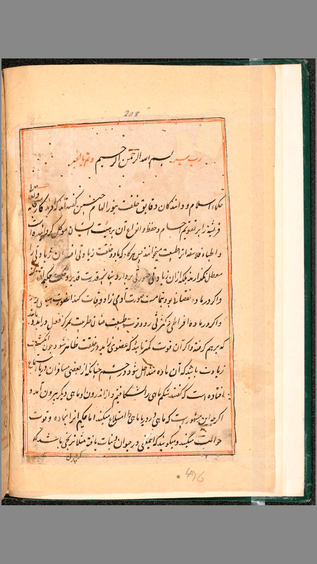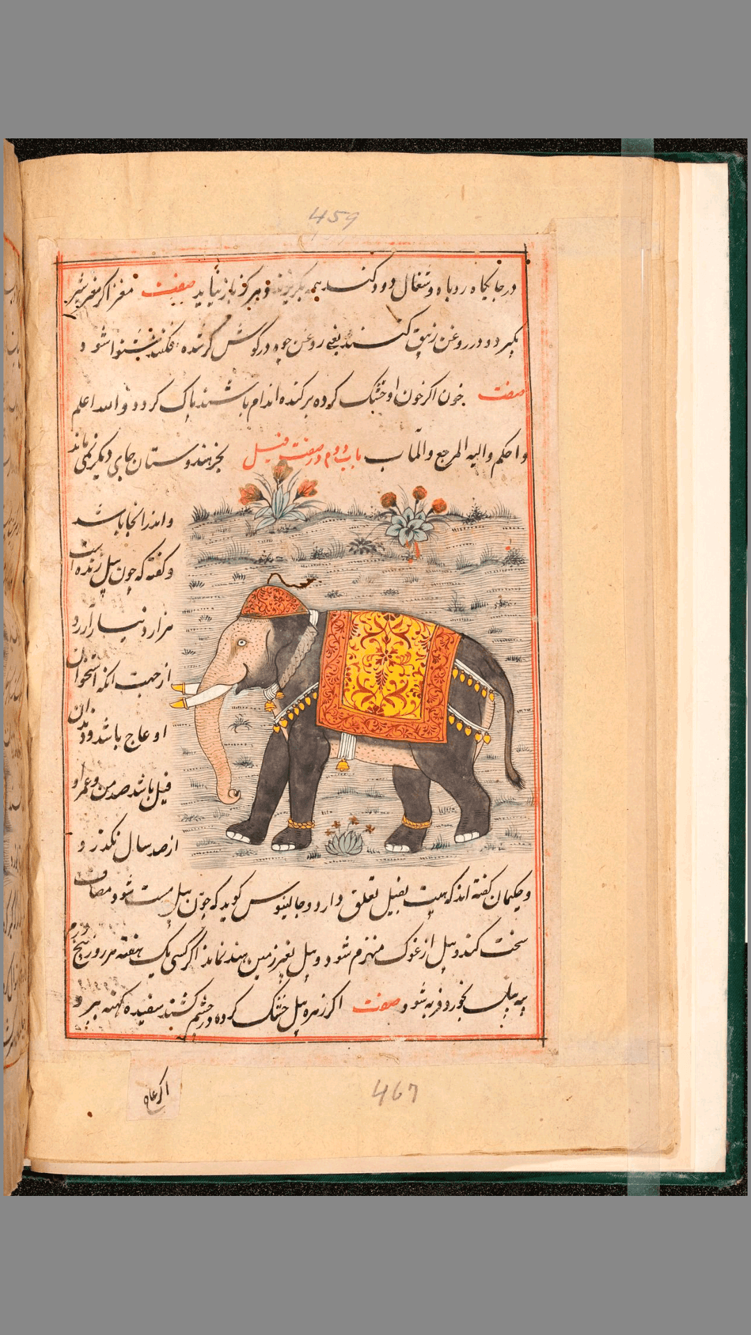 这份波斯语手稿收录了 Faraḥ nāmah(《法拉的自然百科全书》),又称 Ajayib al-dunya (《世界奇迹》)的文本和附图。该作品是穆塔哈尔•伊本•穆罕默德•亚兹迪(al-Muṭahhar ibn Muḥammad al-Yazdi,全盛时期约为 1184 年)撰写的一部自然史专著。手稿抄写于 17 世纪,采用的是大的塔利克字体,并装饰有精美的动物、鸟类、植物、岩石和人物彩色插图。12-13 世纪,波斯微雕画成为一种优雅的艺术类型,并且在伊斯兰国家绘制躺着的人物肖像画也是被允许的。手稿中插图均采用明亮鲜艳的色彩,大部分是二维画作,少数采用了透视画法。插图布局多样,大小不一,在页面上的位置也各有不同,有时还会超出文本框架,使得整部作品看起来极具个性。手稿现收藏在耶鲁大学哈维•库欣∕約翰•海•惠特尼医学图书馆下属的医学历史图书馆。