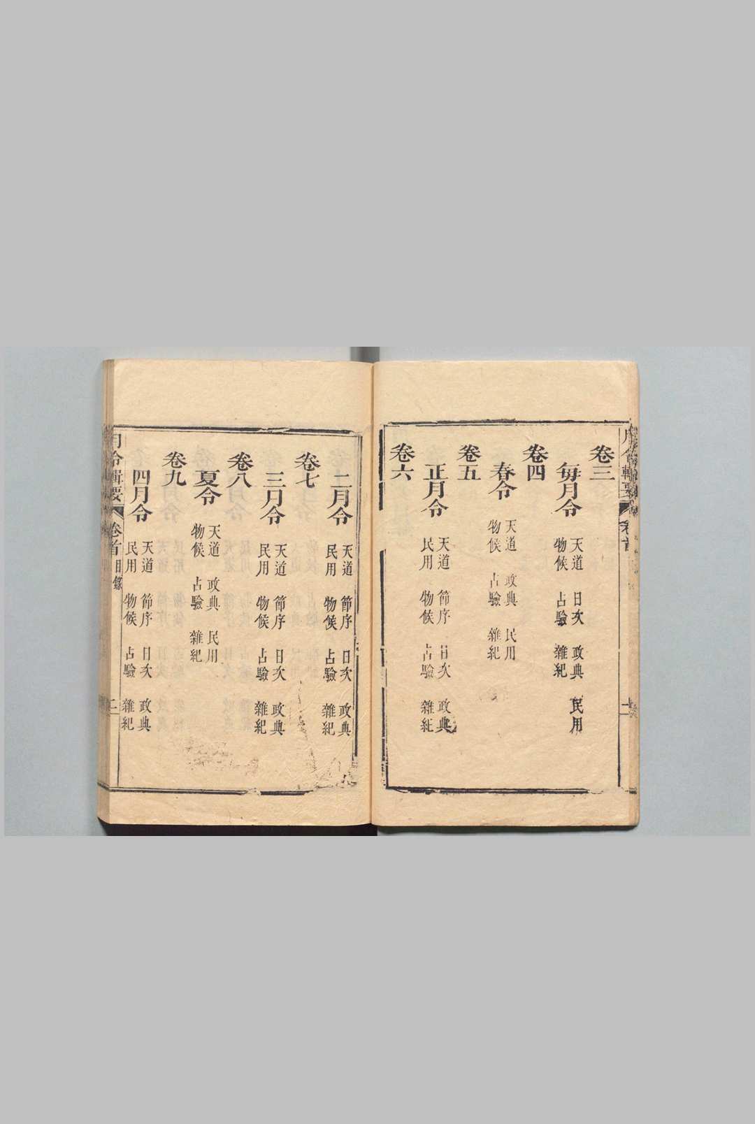 全书分为图说一卷,正文二十四卷,分为:岁令、每月令、春夏秋冬令、正月至十二月令、土王令、闰月令、昼夜令、时刻令。各令按天道、政典、民用、物候、占验、杂纪等子目分别记述。内容主要介绍各种月令及传统民俗活动。