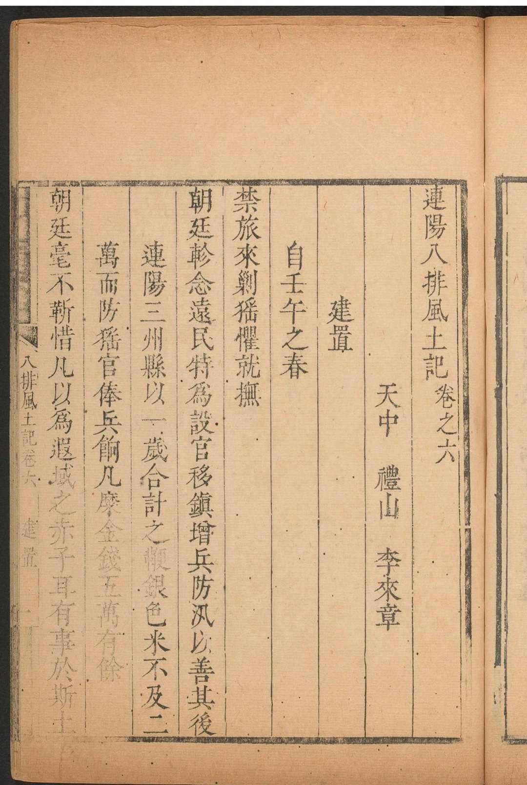来章号礼山,本名灼然,以字行,襄城人。康熙乙卯举人,官连山县知县。是书即其康熙戊子在连山时所作。八排者,猺獠所居,以竹木为砦栅,谓之排也。凡分《图绘》、《形势》、《风俗》、《言语》、《剿抚》、《建置》、《约束》、《向化》八门,门为一卷。其目尚有第九卷,题曰《杂述》上下,然有录无书,岂为之而未成欤?中多自叙政绩。其《向化》一门,纪所判断之案,各为标目。殆似传奇,尤非体例。