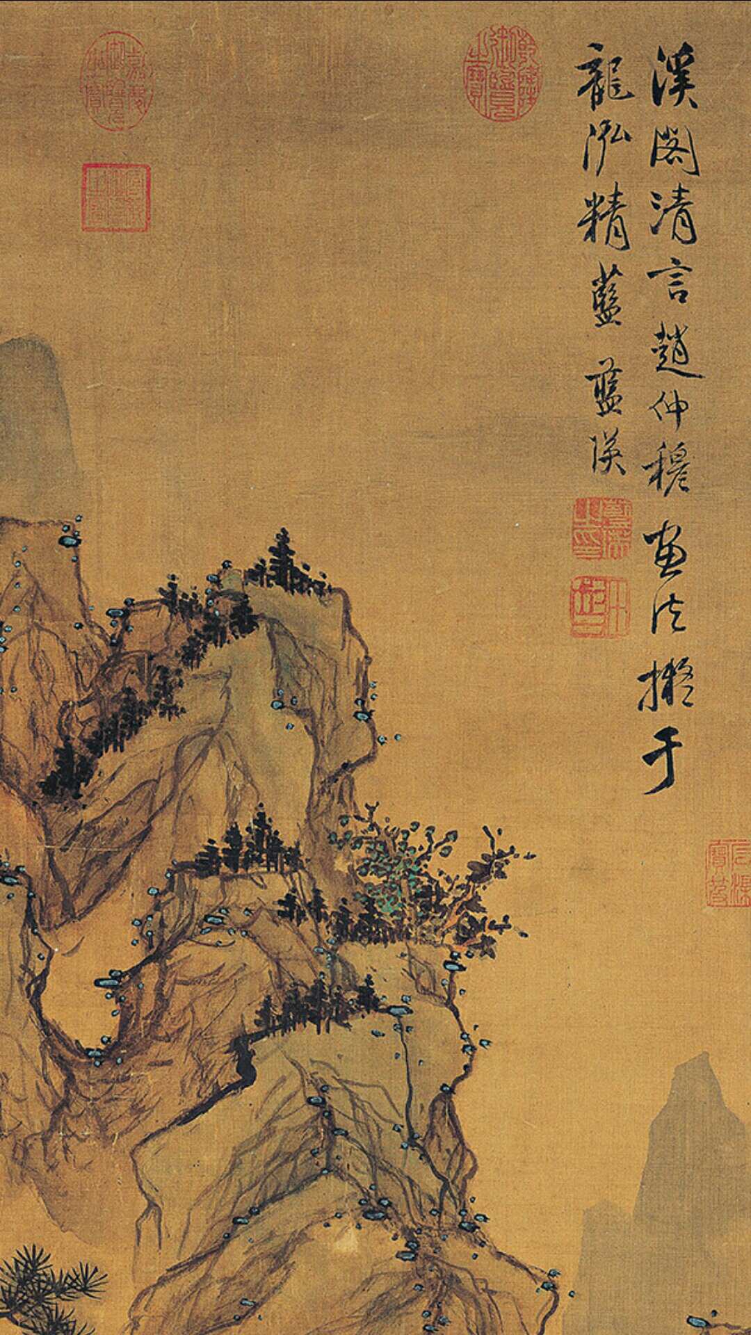 这幅画描绘文人幽静的山居生活。画幅中央一排房舍隐蔽在崇山峻岭之间,楼阁下方有瀑水迂迴曲折流出。两、叁位文人坐在屋内清谈或是读书休憩,充满淡泊閒适的心情。这幅画的构图相当别出心裁,由石壁、长松及屋舍所构成的实景,和瀑布与河流的虚景形成一个交错的S形,让画面充满流动性和深远的空间感。这幅画的灵感来源是元代画家赵雍。画山石的时候,先用「披麻皴」来描绘质理,然后上面再轻轻罩染一层石青、石绿的颜料。山峰上的苔点和攀附松身的女萝,也是用冷色调的石青敷填,显得十分醒目。蓝瑛灵活地运用元代绘画的模式,将它转化成新的绘画语汇,再融入自己的创作之中。