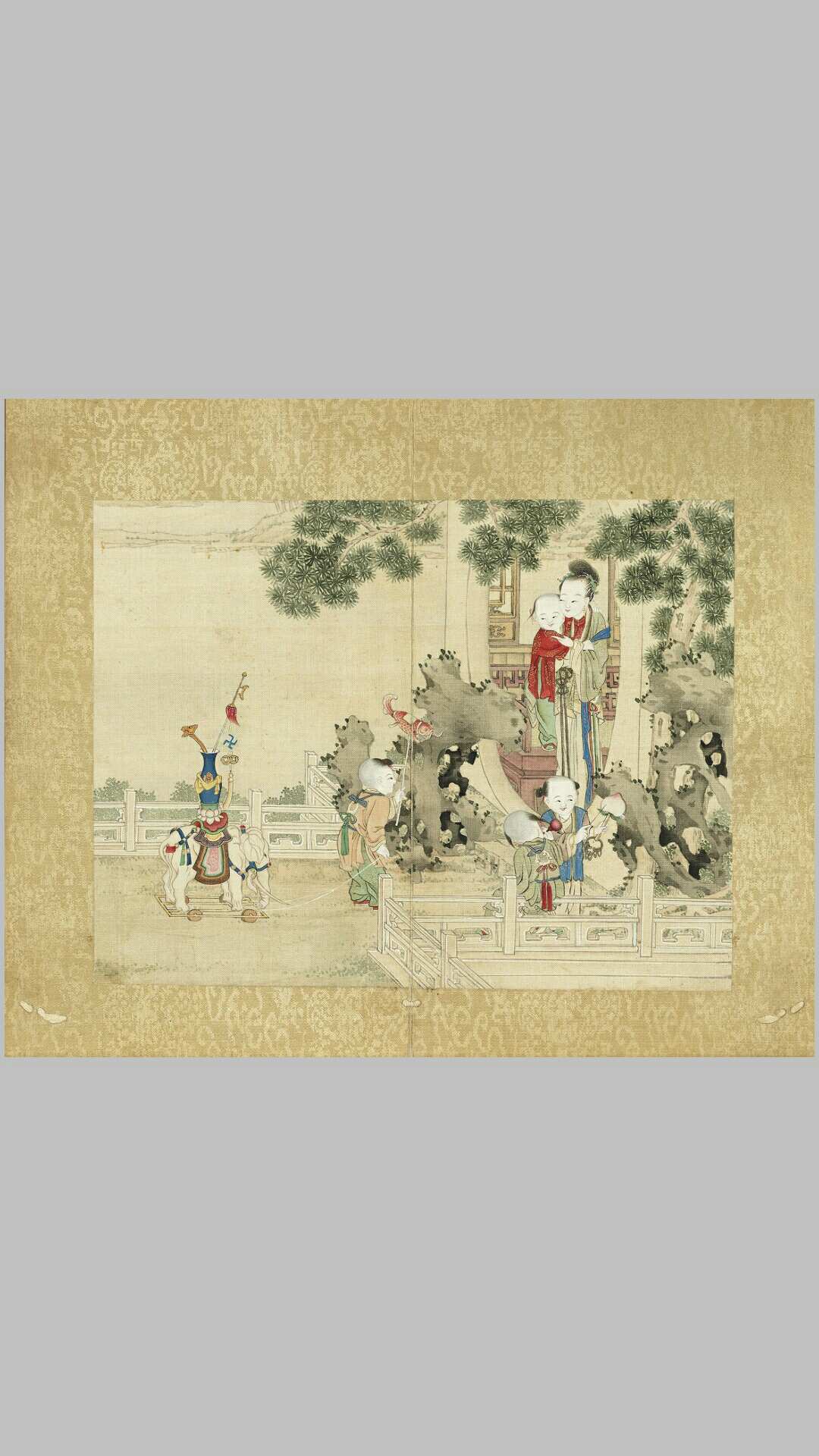 《升平乐事》图册共十二开:白象花灯、蝙蝠风筝、花篮灯、放鞭炮、鹅灯踢毽、大花灯、魁星、钟馗、花烛鹤灯、鹿灯、吉庆平安、独占鳌头。画中描绘提灯有象、鹤、鹿、蝙蝠、鹰、兔,魁星等各样的吉祥涵意图样。此为台北故宫博物院藏本,画无名款,可能为清宫供奉画家之作。