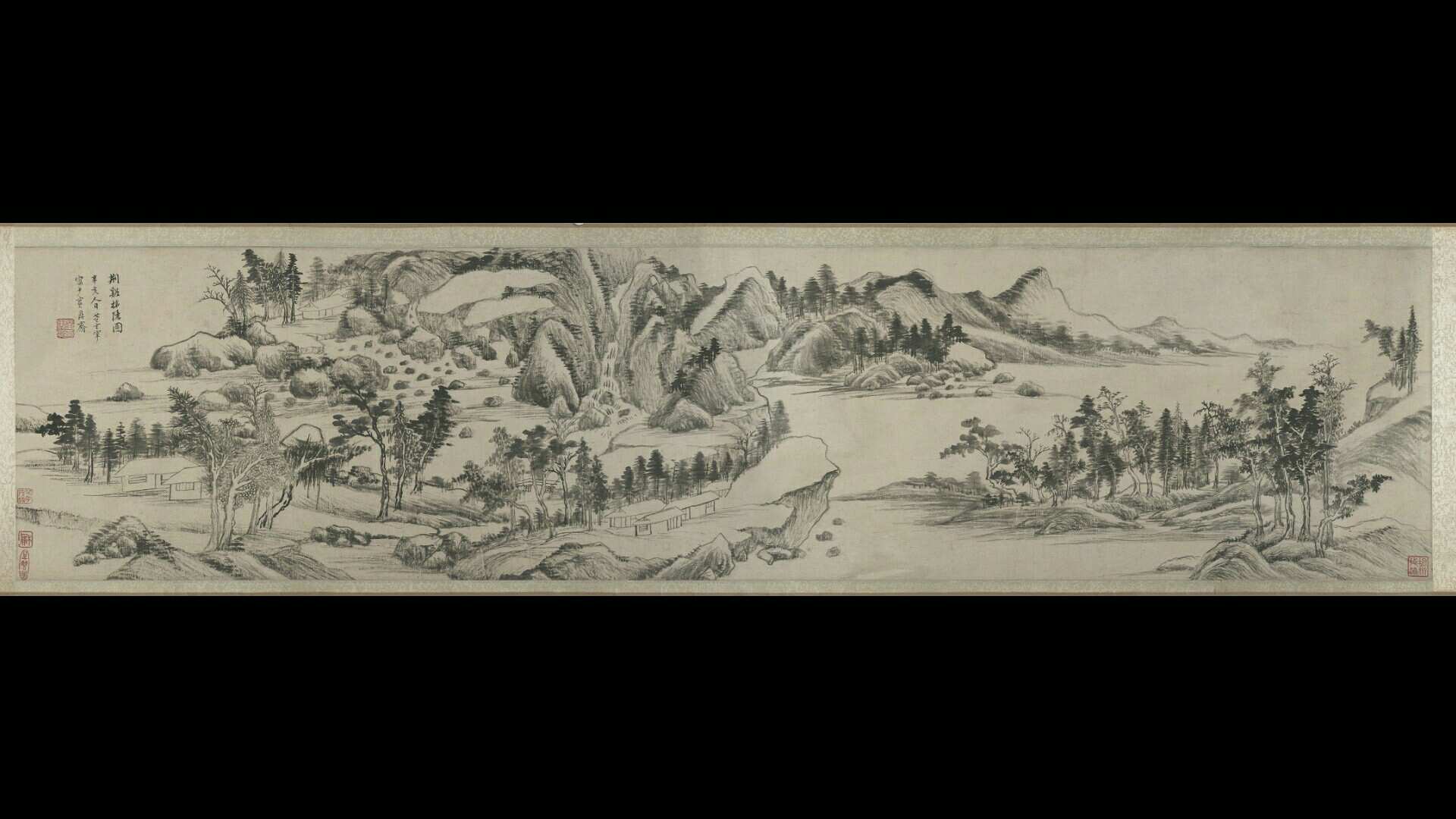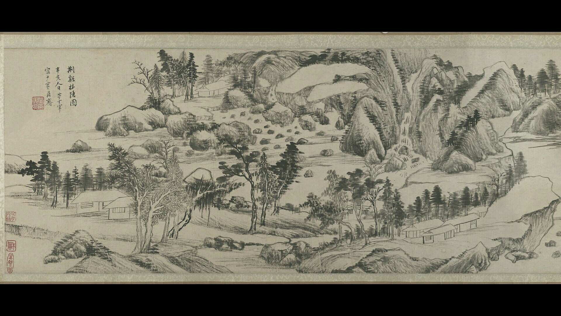 1611年,吴正志在父亲的基础上完成了“云起楼”的建设,邀董其昌来宜兴一住。其间,董为其作《云起楼图卷》;同时,董其昌还为他绘制了此幅《荆溪招隐图》。画卷上,山水清丽,恬静安然,一派文人隐居意象。1613年,董其昌在该画卷尾加跋,表达自己无意做官,向往隐居生活的意愿。四年之后,吴正志在此画卷上加上自己的题跋,把董题名的“招隐”解释为“招去隐居”。