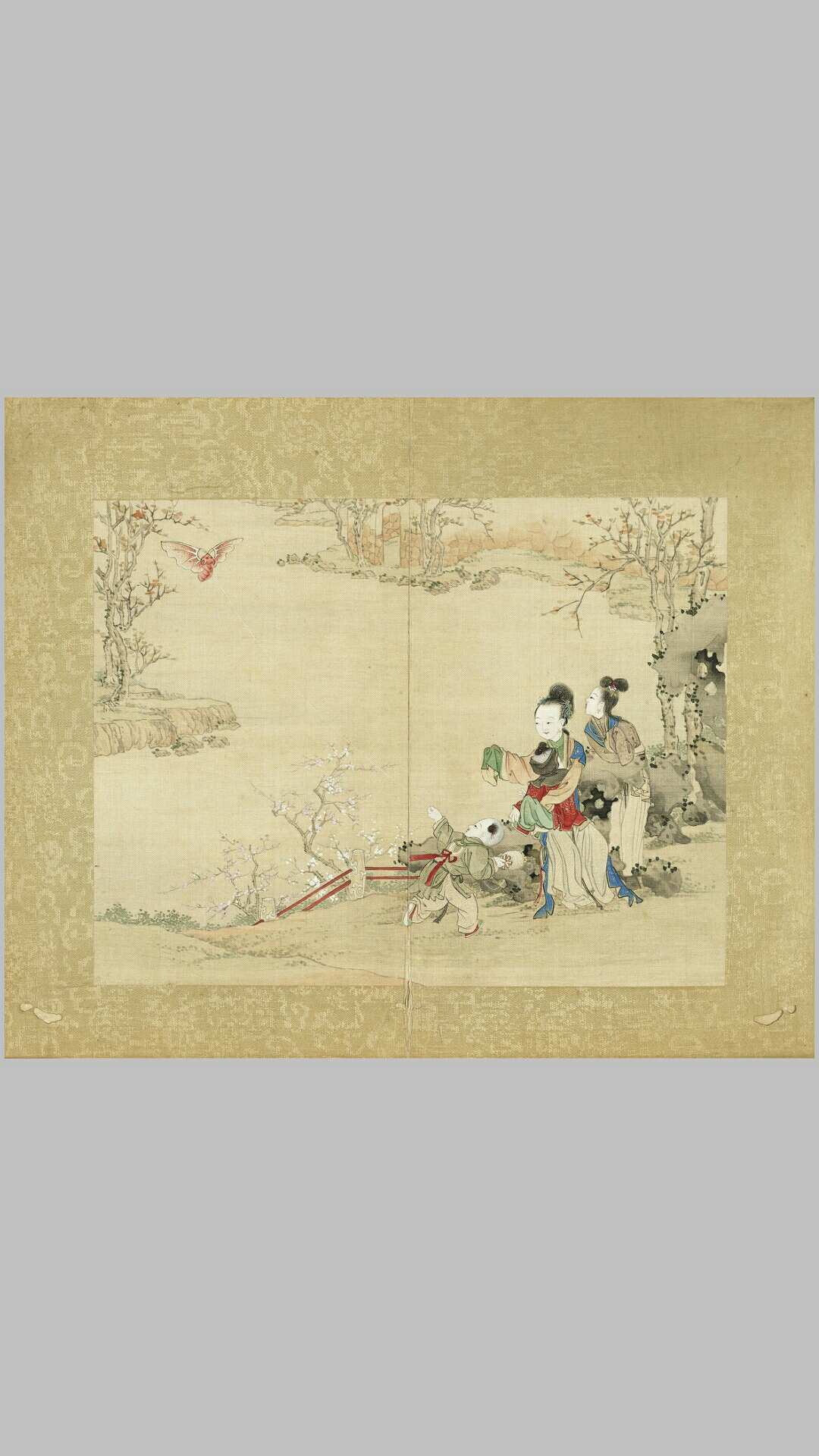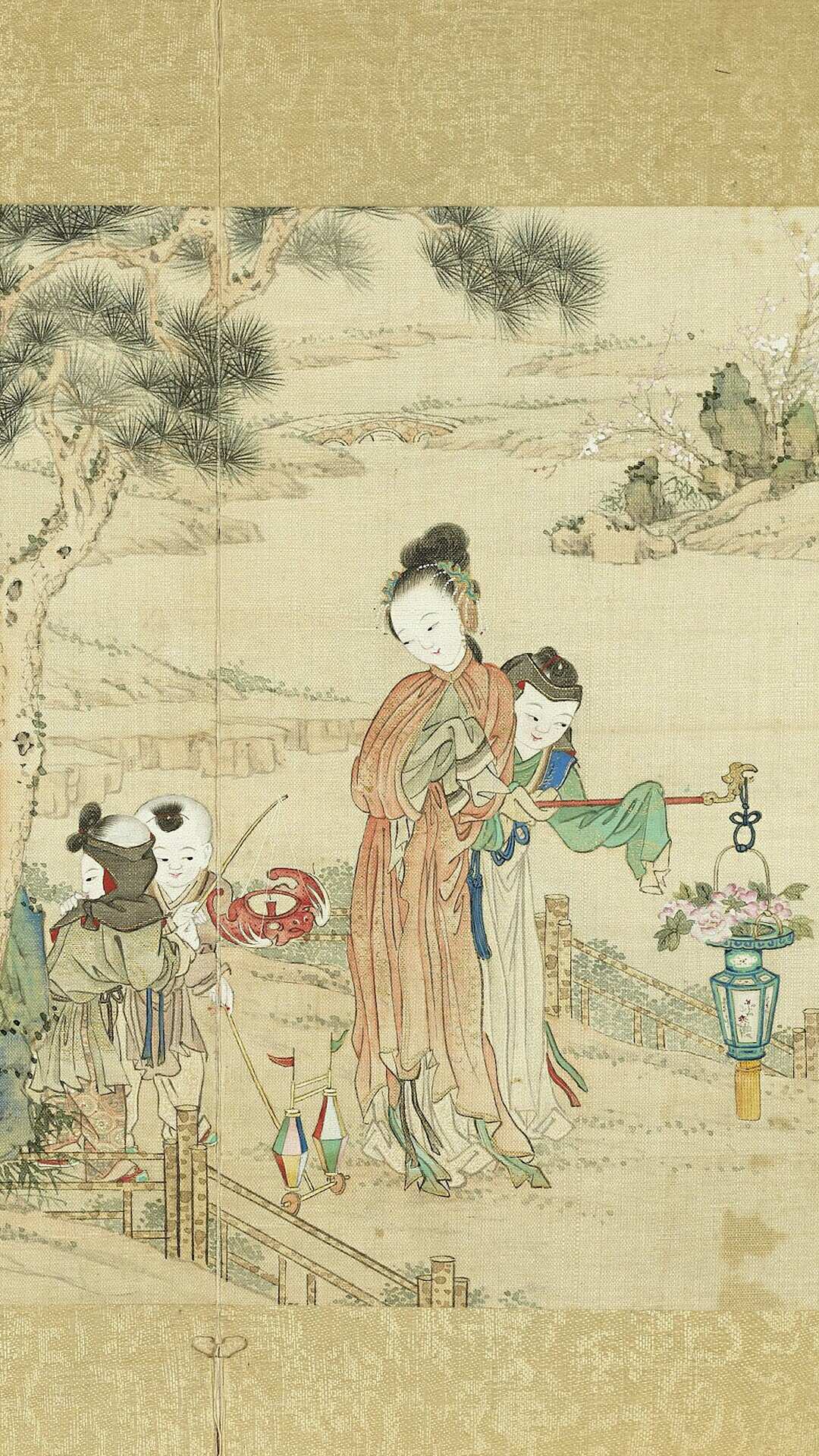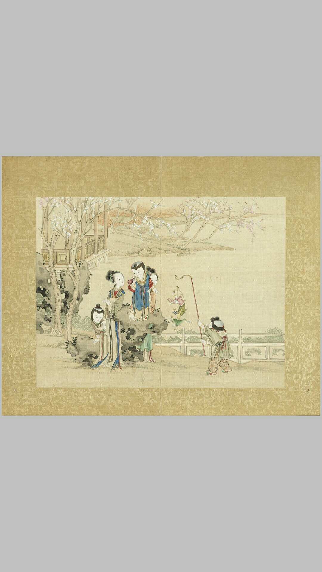《升平乐事》图册共十二开:白象花灯、蝙蝠风筝、花篮灯、放鞭炮、鹅灯踢毽、大花灯、魁星、钟馗、花烛鹤灯、鹿灯、吉庆平安、独占鳌头。