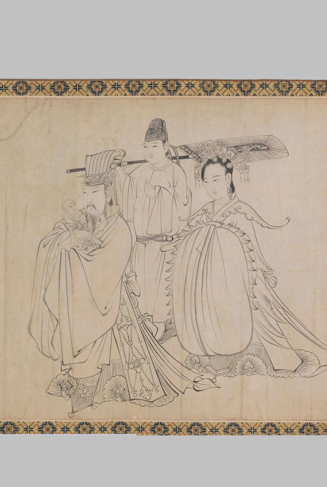 全图分为三个部分:第一段描绘一位王者气度的天神端坐中间,两旁是手执笏板的文臣、捧着砚台的仙女,以及仗剑围蛇的武将力士面对一条由二神降伏的巨龙。第二段画的是一个踞坐在石头之上的四臂披发尊神,身后烈焰腾腾。神像形貌诡异,颇具气势,左右两边是手捧瓶炉法器的天女神人。第三段即《释迦牟尼降生图》,内容是印度净饭王的儿子出生的故事。从画面上,可以看到释迦牟尼降生时,他的父亲抱着他到寺庙朝谒见自在天神的情景。