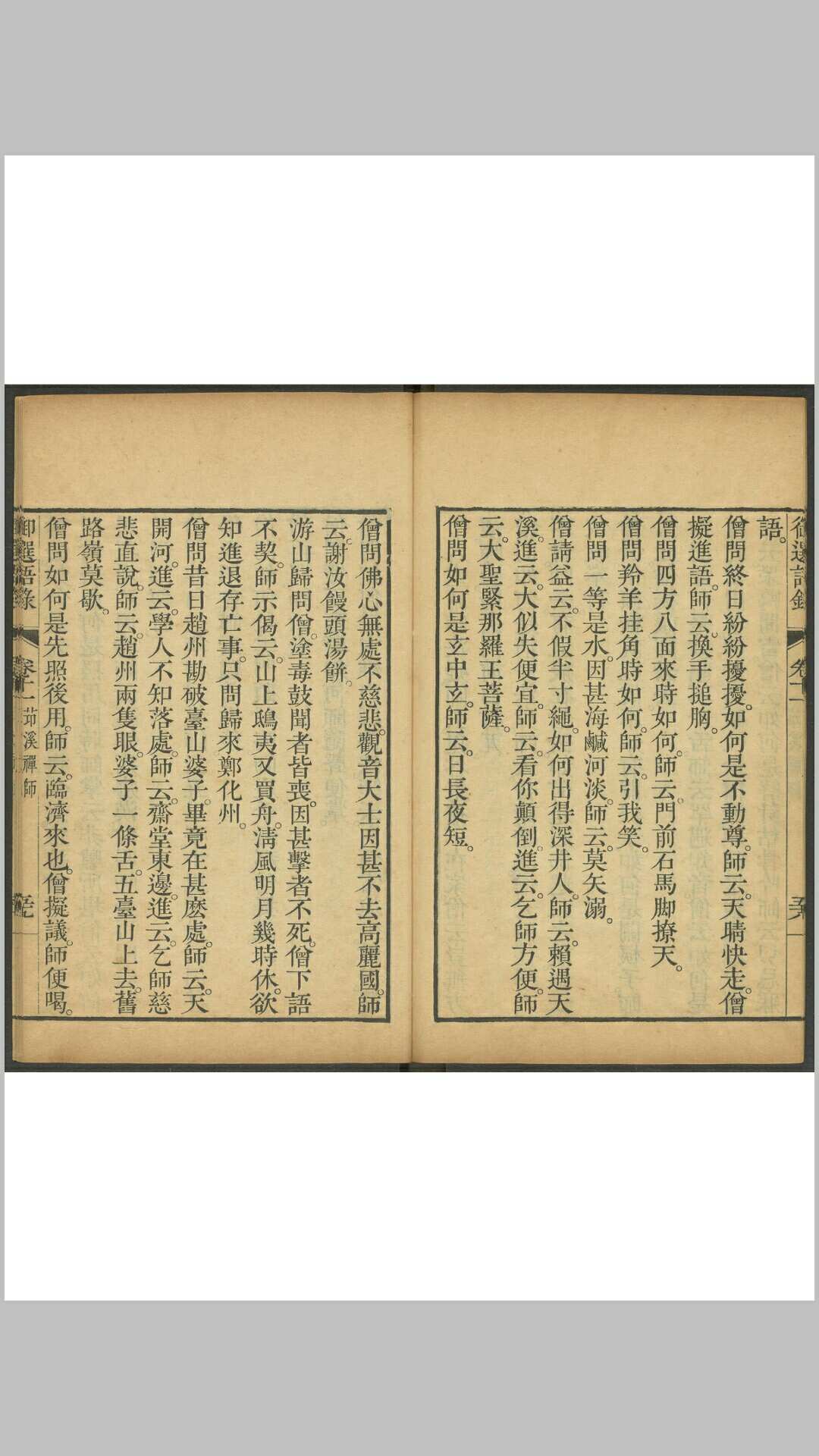 俗称《雍正御选语录》。十九卷。清世宗雍正帝胤禛编。收于《万续藏》第一一九册、《禅宗全书》第七十八册、《龙藏》(新文丰版)第一六三册。雍正十一年(1733)刊行。系世宗归依佛法后,从历代祖师语录中,捡选能提升向上、直指真实宗旨的语录编辑而成。
