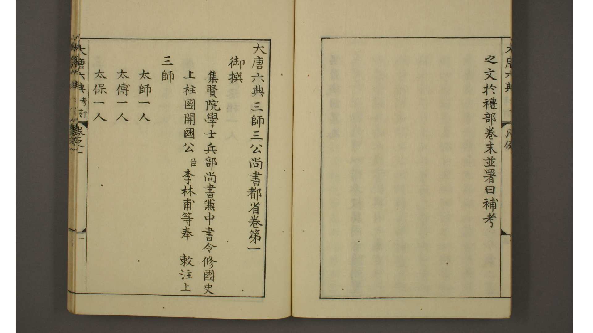 中国南宋绍兴四年(1134)温州州学刻印的唐代官修记述当时职官制度的著作。书成于开元 (713~740) 时,题唐玄宗李隆基撰,李林甫等注,实出于张九龄等人之手。共三十卷。内容以三师、三公、三省、九寺、五监、十二卫等为目,列述其职司、官佐、品秩等。书中所定制度、规程,当时并未完全实行,但唐人议论典章、仪制时,每加引用。