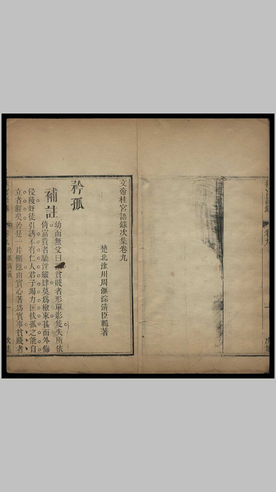 《桂宫语录次集》二十四卷、十二册,清卧云居士周汇淙辑著,道光八年镌行。此书以《文昌帝君阴骘文》为纲目,广收博采诸书,“每句系以注、继以广义、申以颂、终以案证,务使阅者事理通透、惩劝厘具”。周汇淙,字清臣,湖北武昌府咸宁县(今咸宁市咸安区)人,清道光九年己丑科进士。