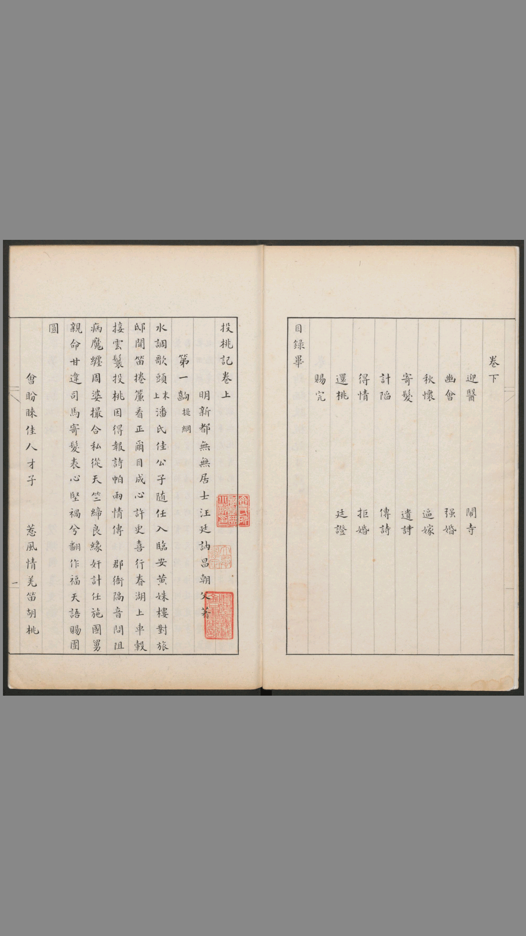 微盘下载:环翠堂新编投桃记.二卷.明汪廷讷撰.民国.王立承精钞本