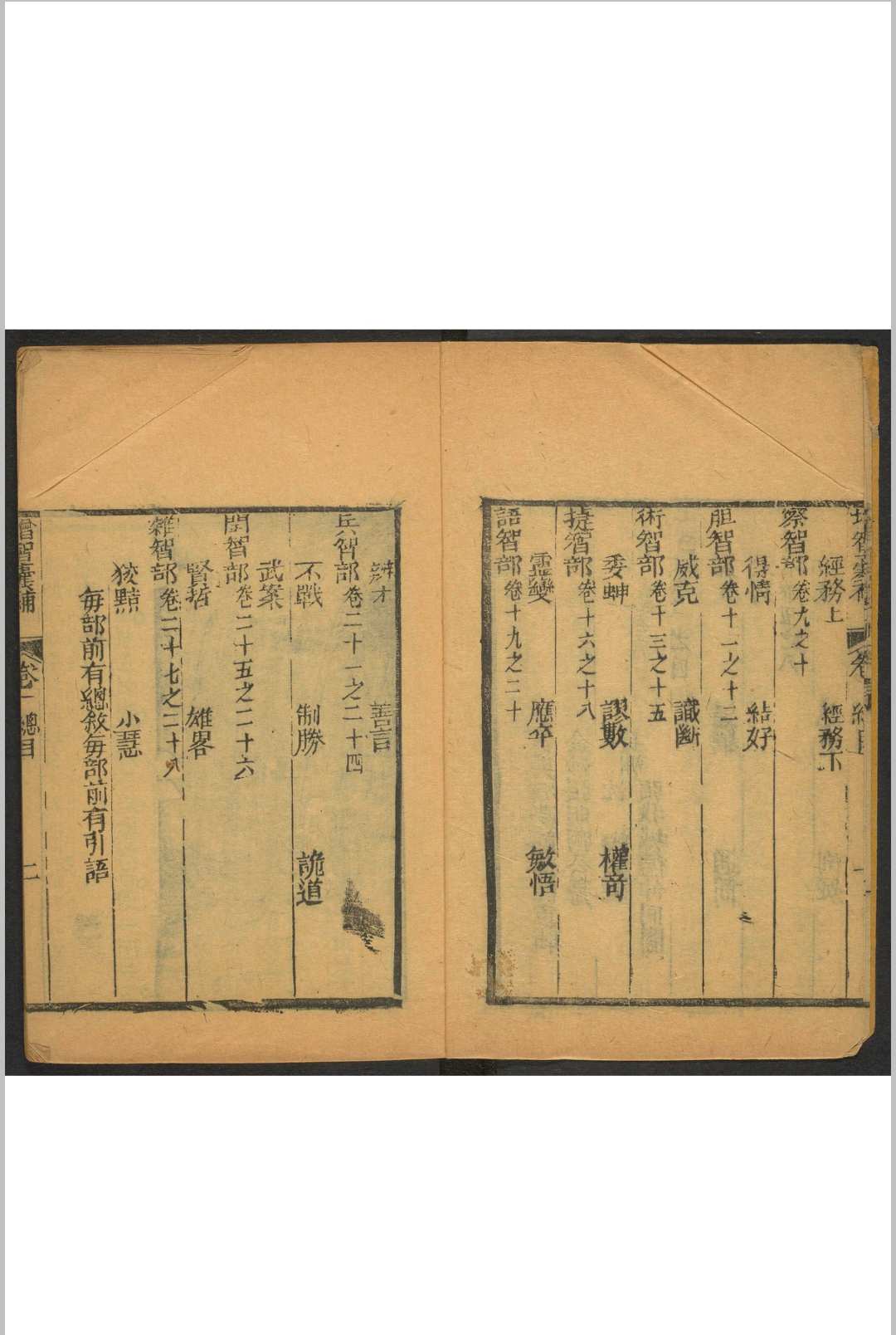 共分上智、明智、察智、胆智、术智、捷智、语智、兵智、闺智杂智十部二十八类,每类一卷。将明代以往的子史经传与野史丛谈中有关智慧的各种故事近两千则,上自经国大略,下至市井小智,对其进行部类分别,按以评语,同时就在分类和评语中表述自己的政治见解。全书反映社会内容较广泛,涉及政治管理问题的散见于各部,涉及社会市民生活的小说多集中在闺智、杂智二部。