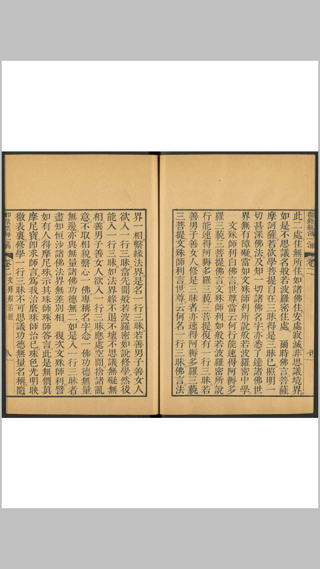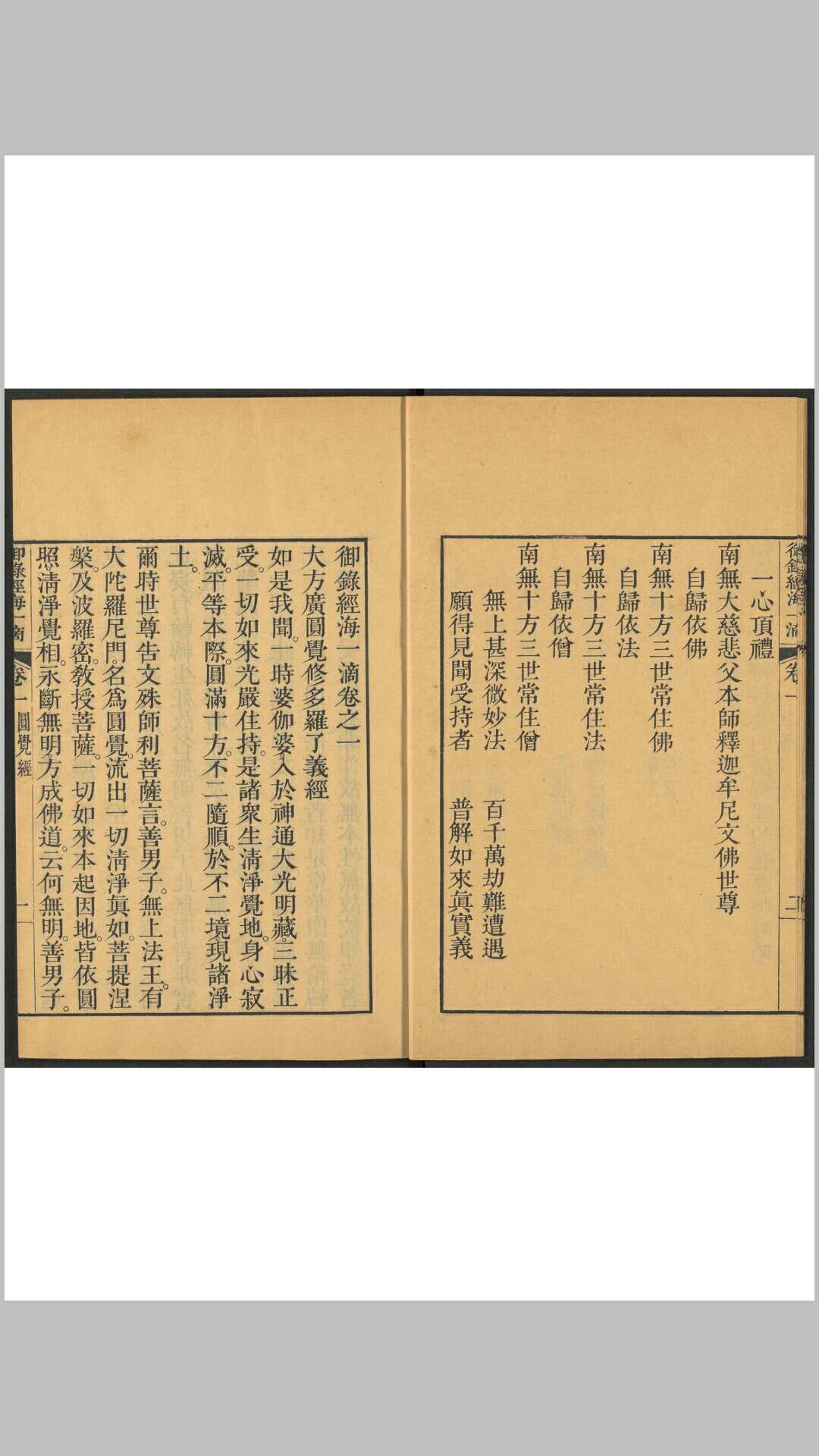 《御录经海一滴》共六卷。清雍正帝以佛经文字至为浩瀚,于是节录《圆觉经》、《金刚经》、《楞严经》、《妙法莲华经》、《涅盘经》等二十部佛经,每部经亲录数十则,以便展诵。前有御制序和如来说法图一幅,后有韦陀像一幅和御制大般涅盘经跋。此为清雍正十三年武英殿刊本。
