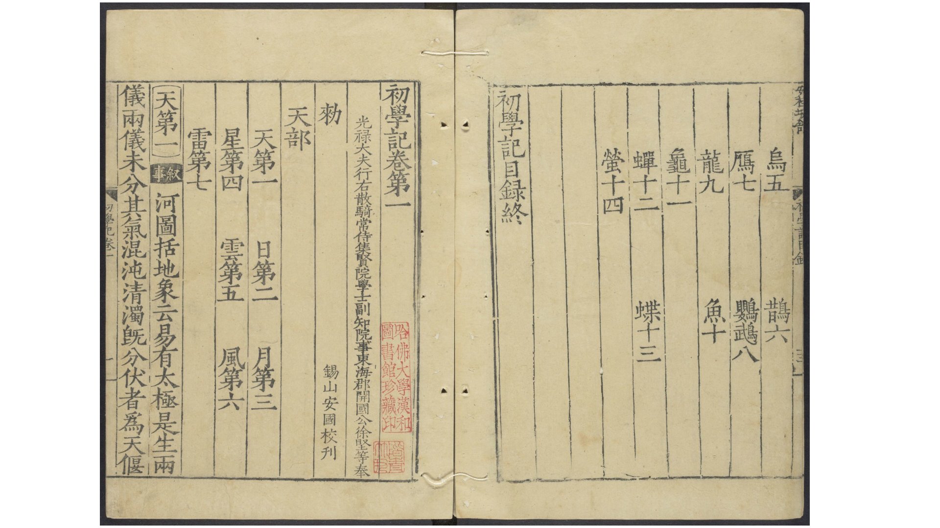 此《初学记》为唐玄宗时徐坚奉敕纂辑的一部官修类书。此书的编撰原为唐玄宗诸子作文时检查事类之用,故名《初学记》。全书共三十卷,取材于群经诸子、历代诗赋及唐初诸家作品,保存了很多古代典籍的零篇单句。此为明嘉靖十年锡山安国桂坡馆刊本。