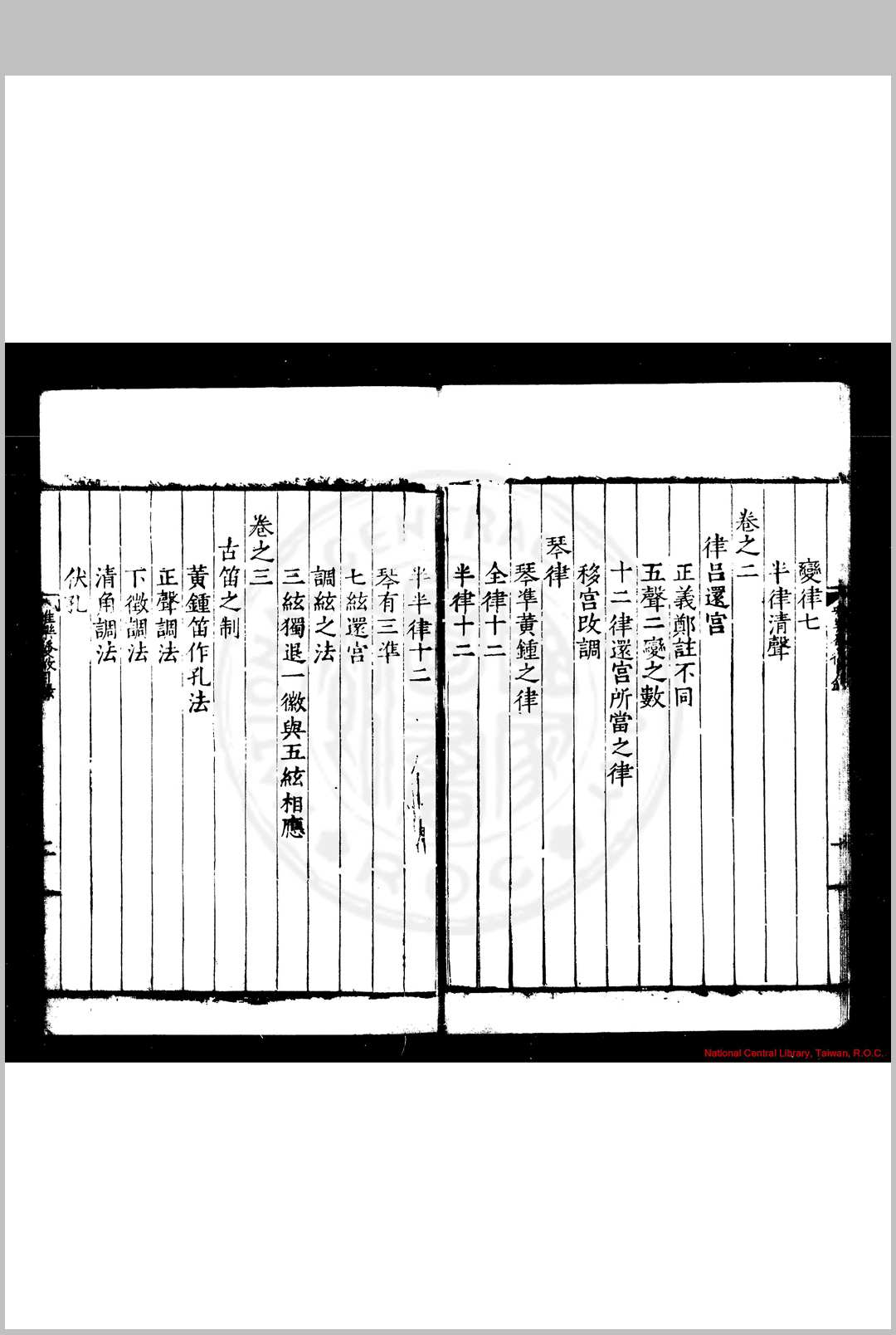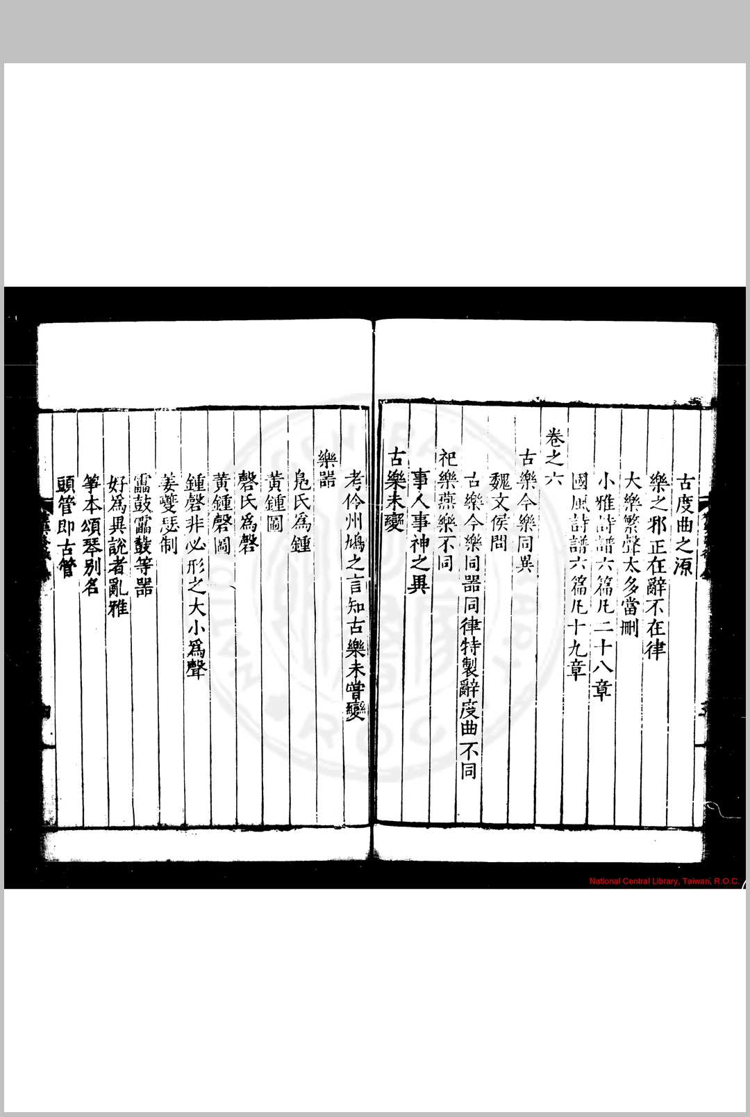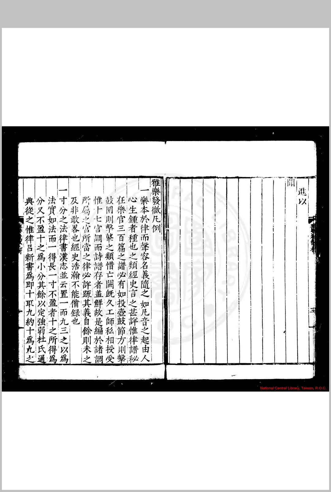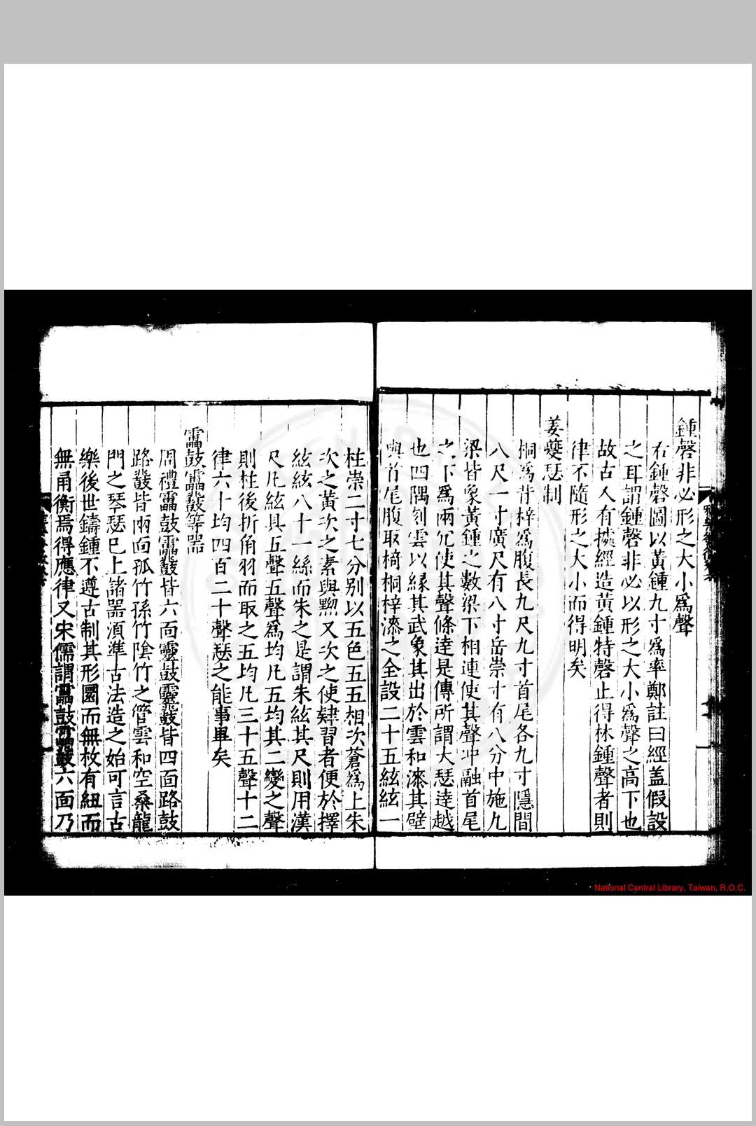 明张敔撰。考明有两张敔。其一字伯起,合肥人。永乐中贡入太学,除广东道监察御史,官至陕西按察使佥事。所著有《京氏易考》,见朱彝尊《经义考》。此张敔饶州人。朱载堉《律吕精义》第五卷中载有其名。又《明史·陆粲传》,载粲《劾张璁·桂萼疏》,有“礼部员外郎张敔假律历而结知”之语,与此书亦相合,盖即其人也。敔论乐大旨,以入声最低者命为黄钟,其最高者为应钟之变宫。是书自元声正半律诸法以逮乐器、乐歌、悬图舞表,分门毕具。后又作《雅义》三卷附之,六十律、八十四调、十六钟以及累黍生尺之法无不悉究。其《序》谓论琴律本之朱子,论笛制本之杜夔,论旋宫本之《周礼》,论钟钅尃本之《国语》,於乐制颇有考证。然如论蕤宾生大吕,主《吕览》、《淮南子》上生之说。不知律吕相生定法,上生与下生相间,故左旋与右旋相乘。今应钟既上生蕤宾,而蕤宾又上生大吕,与上下相生之序极为错迕。乃先儒已废之论,殊不足据也。