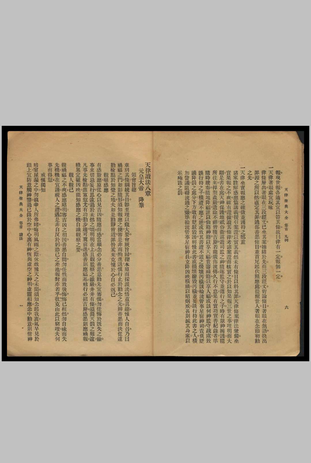 《天律圣典大全》,十三卷、二册,西昌种、复善园原本,西昌李厚杰、李时品原校,民国廿一年(1932)上海明善书局校印。述古老人题签。书前有曾维垣、张载阳的题词,以及郭夑熙、唐光先的题赞二首。署名:天律总裁雷祖大帝鉴定,天律副总裁玄天大帝校订,天律监临中皇大帝鉴订,天律都监元皇大帝校勘。