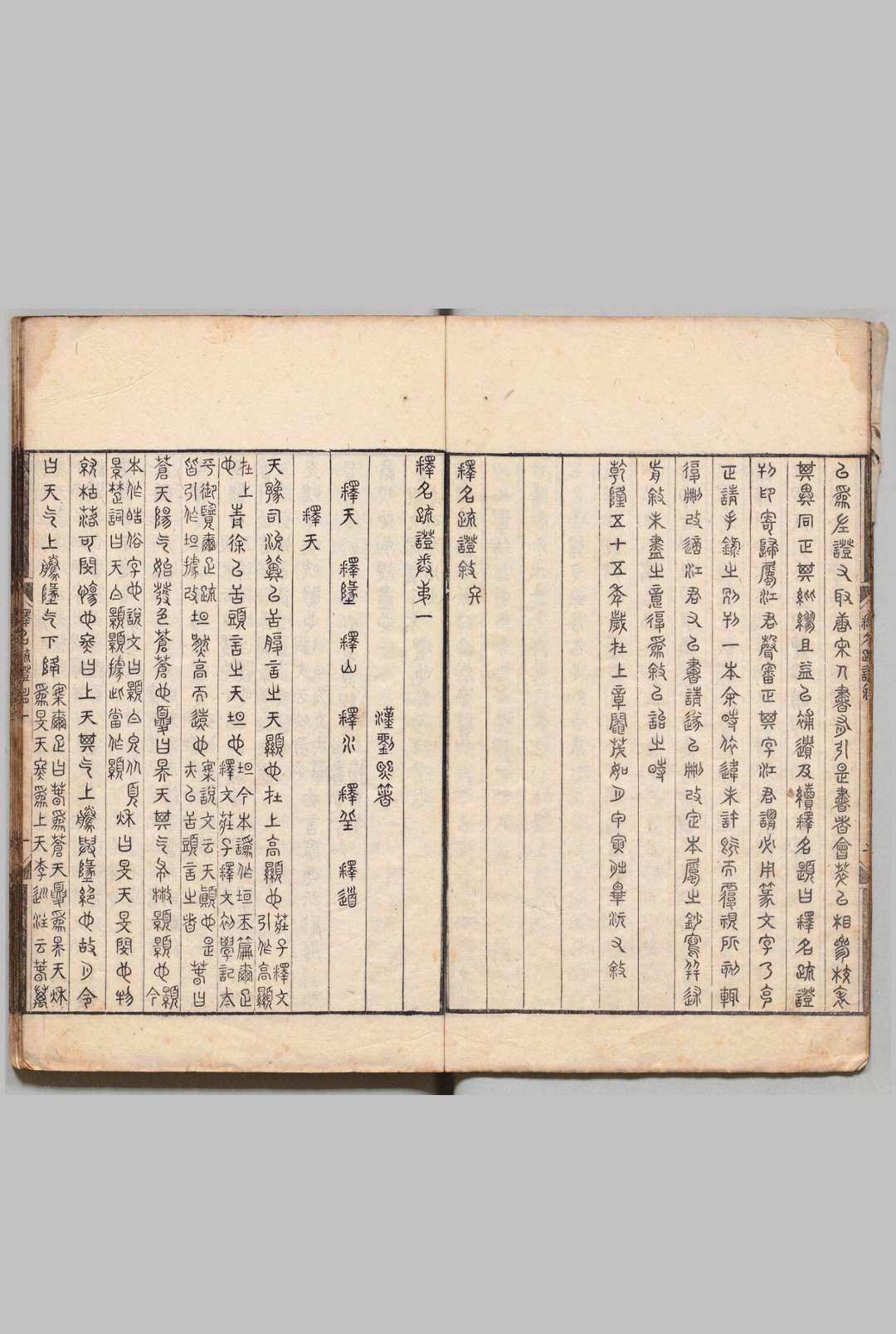 《释名疏证》10卷。约成书于清乾隆五十四年(1789)。毕沅(1730~1797),字纕蘅,一字秋帆,号灵岩山人。江苏镇洋(今江苏太仓)人。乾隆进士,授修撰,历官陕西按察使、陕西巡抚、河南巡抚、湖广总督。治学范围广,由经史旁及训诂、金石、地理。其著述多收入《经训堂丛书》。