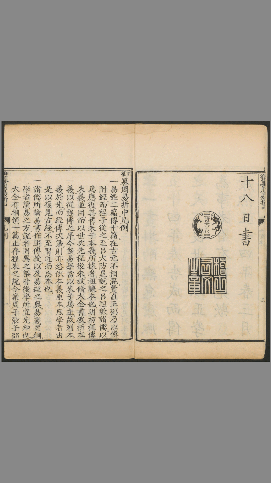 此本是清康熙皇帝参与编写关于《周易》的书籍,所以称作“御 纂”。康熙年间设刻书处于武英殿,故有殿板之称。全书共23卷,正文22卷,卷首1卷。