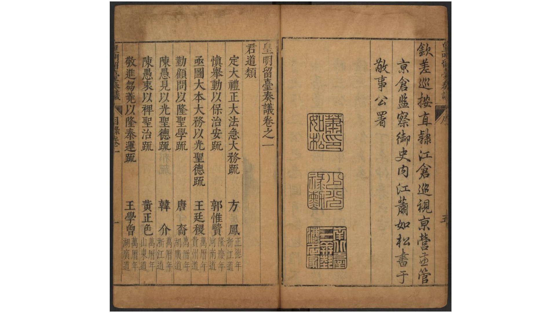《皇明留台奏议》二十卷,明朱吾弼、李云鹄、萧如松、孙居相共辑,明万历三十三年刻本。朱吾弼,字谐卿,号密林,高安人,万历己丑进士,官至南京太仆寺卿,著有《朱子奏议》等,时李云鹄,萧如松,孙居相皆官南京御史,故与朱吾弼同辑本书。所谓“留台”,特指王朝迁都后,留置于旧都之官署,相当于留都,明成祖朱棣迁都北京后,保留了南京的都城地位和中央机构,因此南京即为“留台”。本书传世稀少,所载奏疏起自正德,终于万历,皆为明朝中后期南京御史所作,不仅反映了明王朝由盛转衰的趋势,其中关于漕运、矿税等奏疏更富经济史料价值。本书内容共分二十门,包括君道、修省、好尚、储贰、宗藩、厘正、臣职、国纪、时政、用人、援直、民隐、财储、矿税、兵防、漕河、爵谥、举劾、近幸、权奸等。现影印出版,弥补正史之不足。