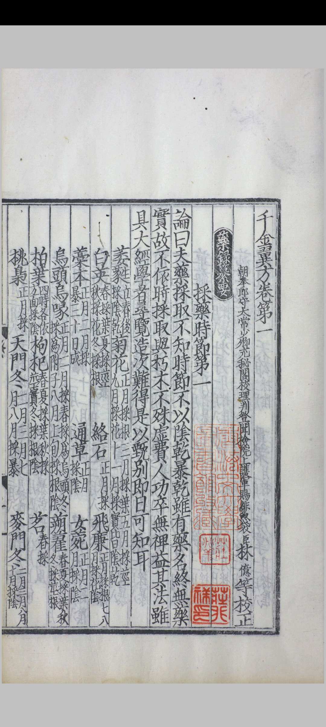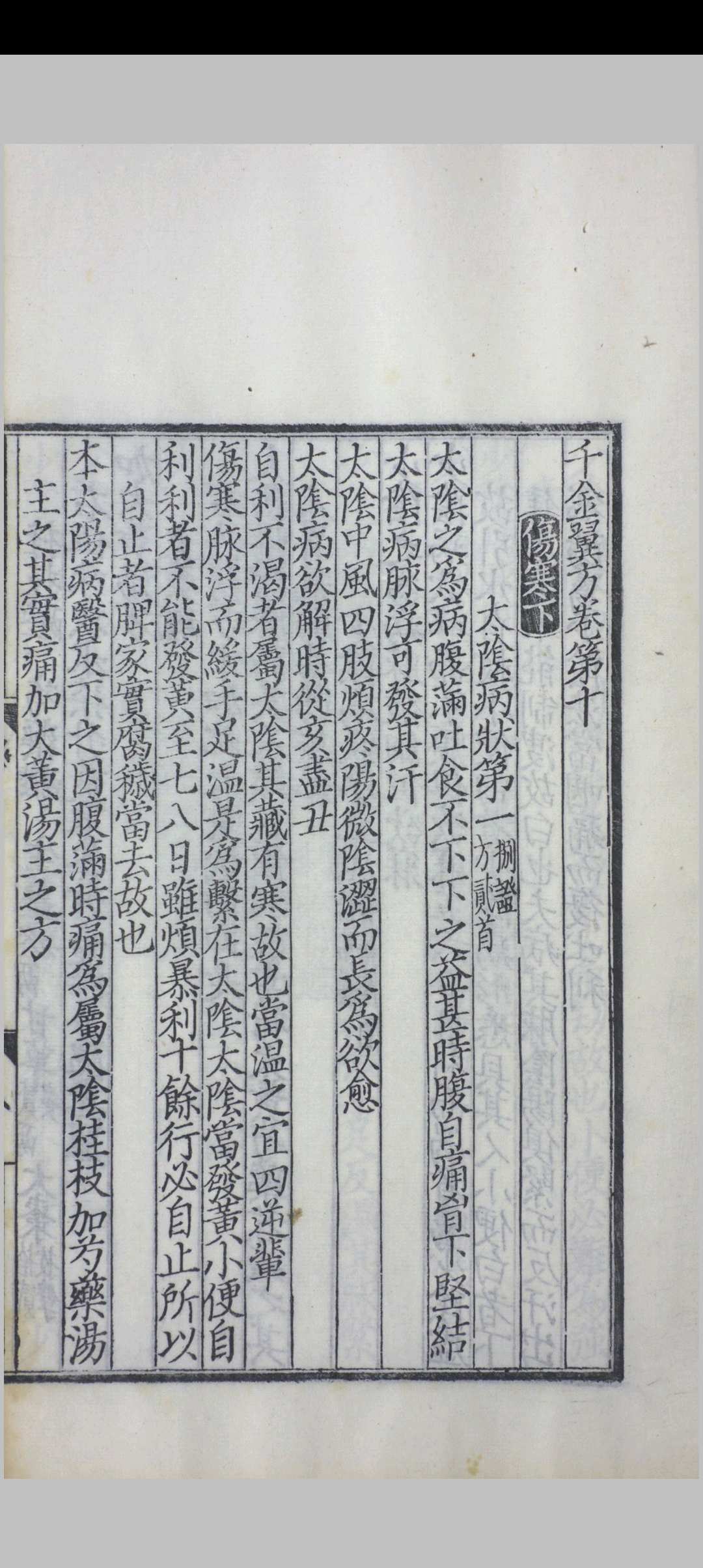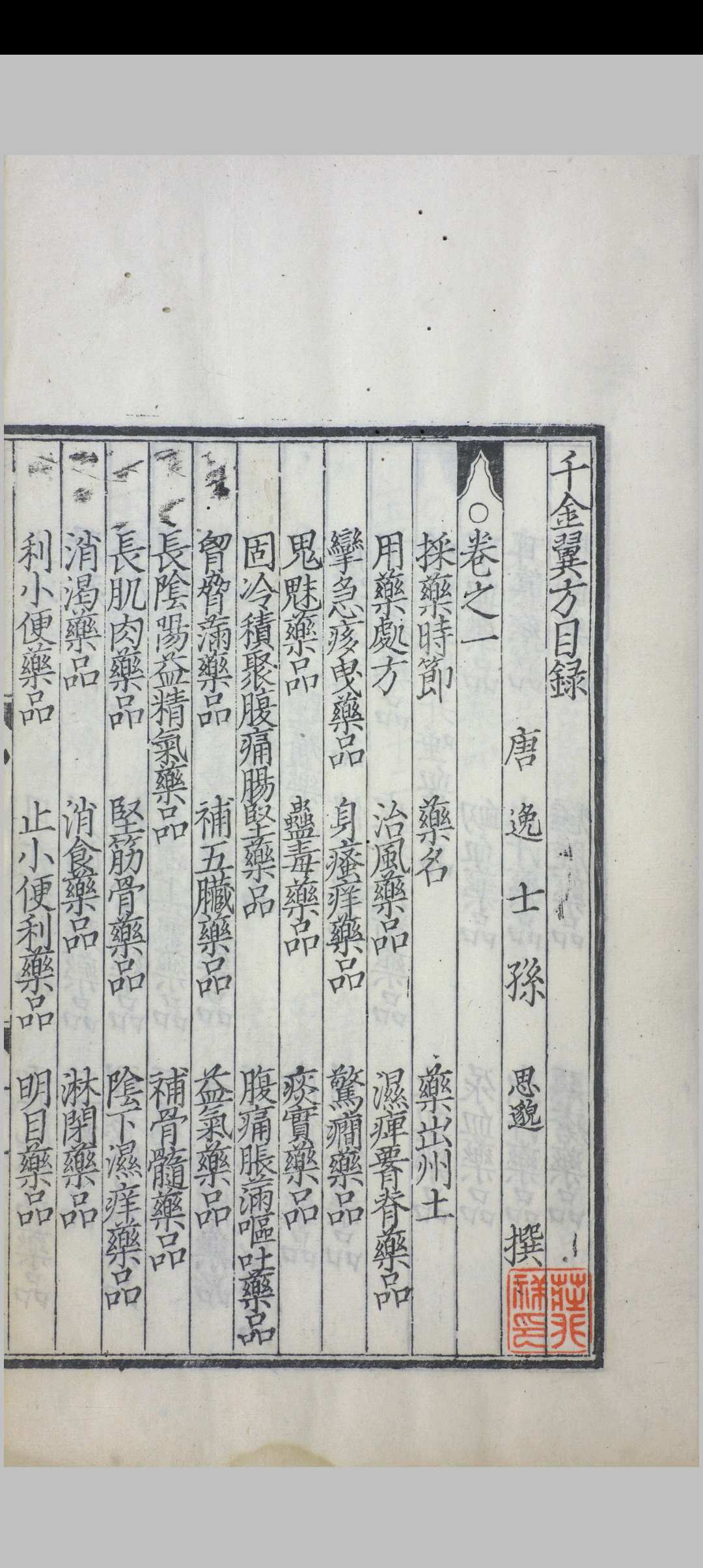 《千金翼方》,唐代医学家孙思邈撰,约成书于永淳二年(682)。作者集晚年近三十年之经验,以补早期巨著《千金要方》之不足,故名翼方。孙思邈认为生命的价值贵于千金,而一个处方能救人于危殆,以千金来命名此书极为恰当。《千金翼方》全书共三十卷,北宋时期校正医书局对其传本予以校正,并刊行全国。宋代印本在明代以前失传了,所幸印版保存了下来,明朝万历年间,翰林院纂修官王肯堂奉万历皇帝之命纂刻了宋版《千金翼方》。《千金翼方》是我国历史上最重要的中医药典籍之一。