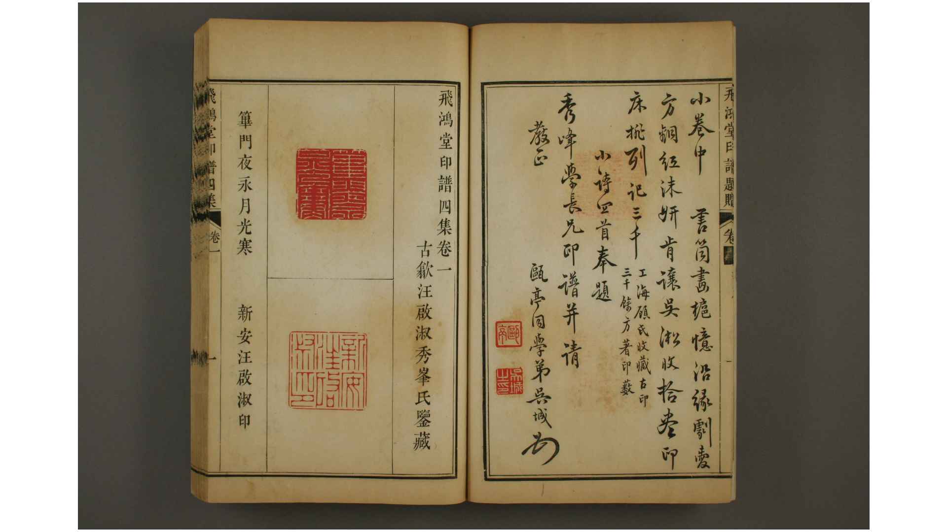 《飞鸿堂印谱》是汪启淑精心辑录家藏古铜印以及当时一百数十家印人篆刻而成。四十卷,共五集,每集四册,五集合二十册,各册有二卷,每卷二十五页,每页录二印至四印,附注释文。收录极为谨慎,每印皆经汪氏与诸同好虚心商榷,方始奏刀,故编辑印谱时间前後约有三十馀年。是书成于1776年,共收录印数约为三千五百方,与《学山堂印谱》、《赖古堂印谱》合称为“至美之三堂印谱”。