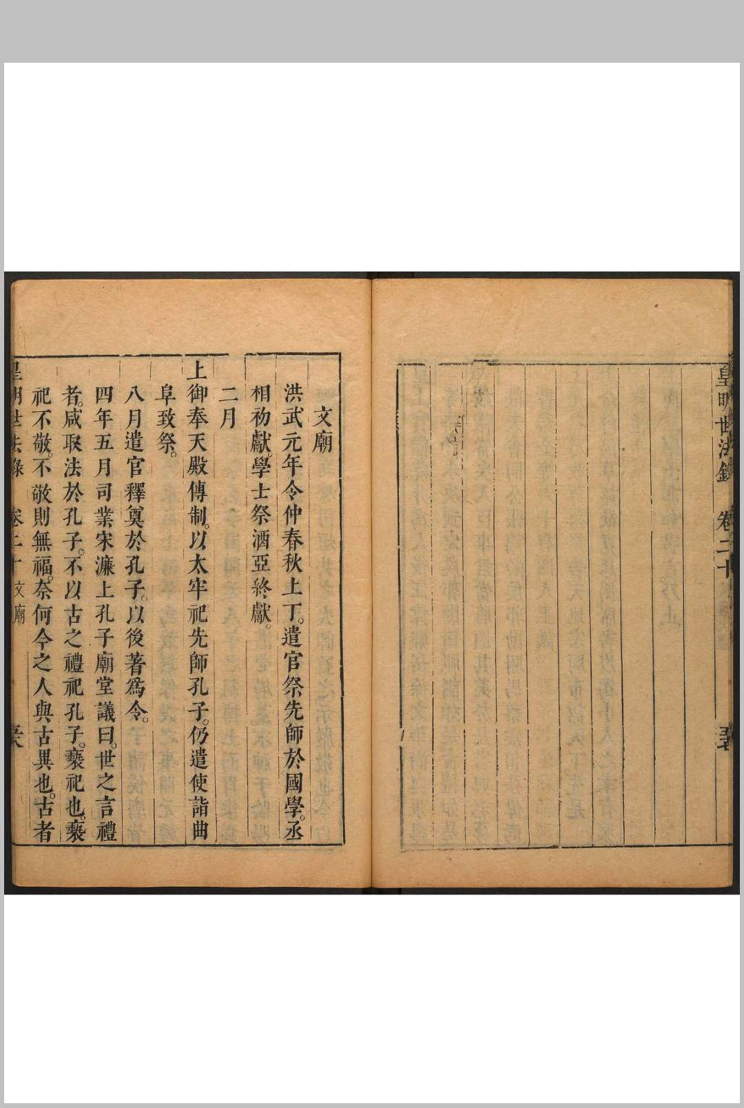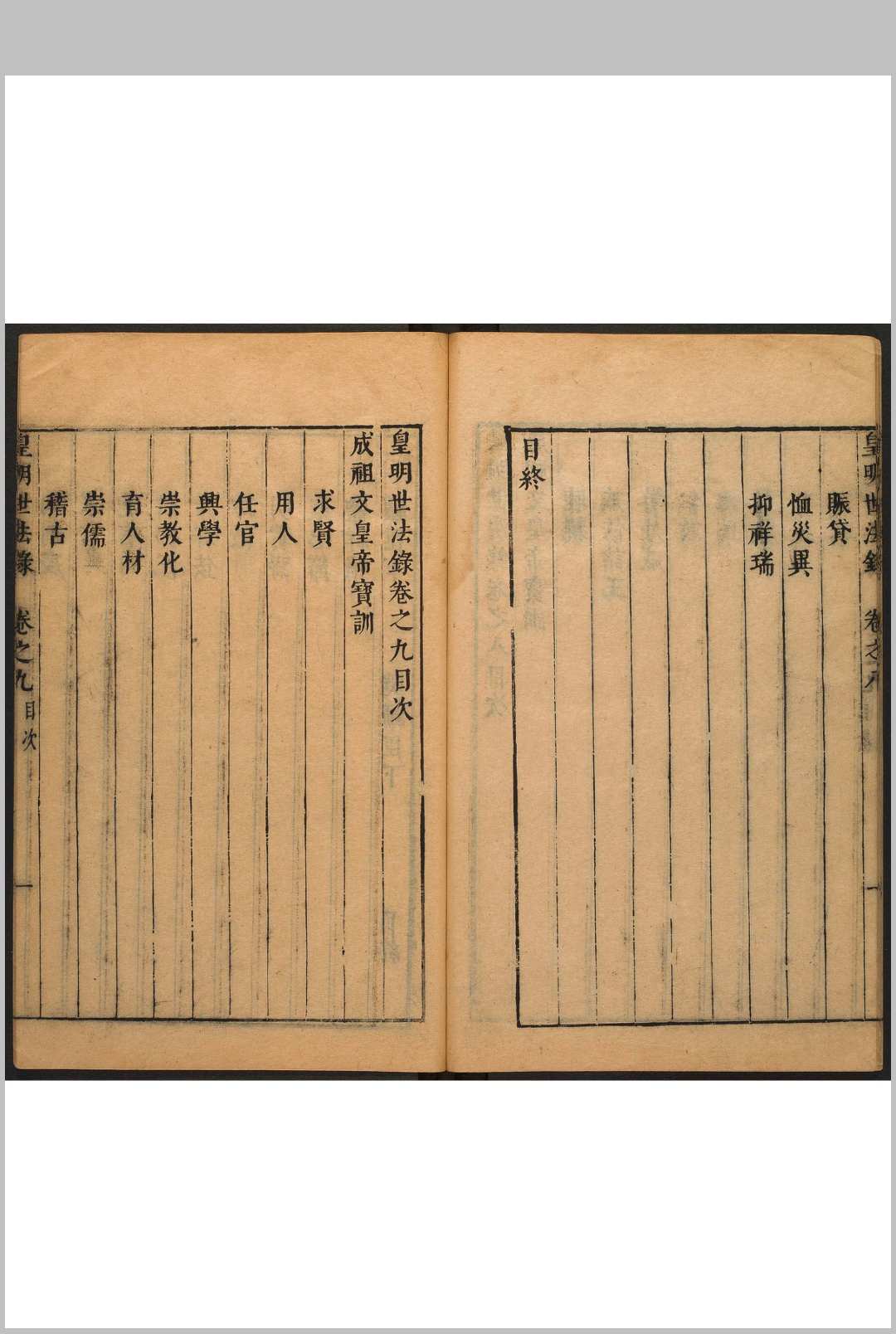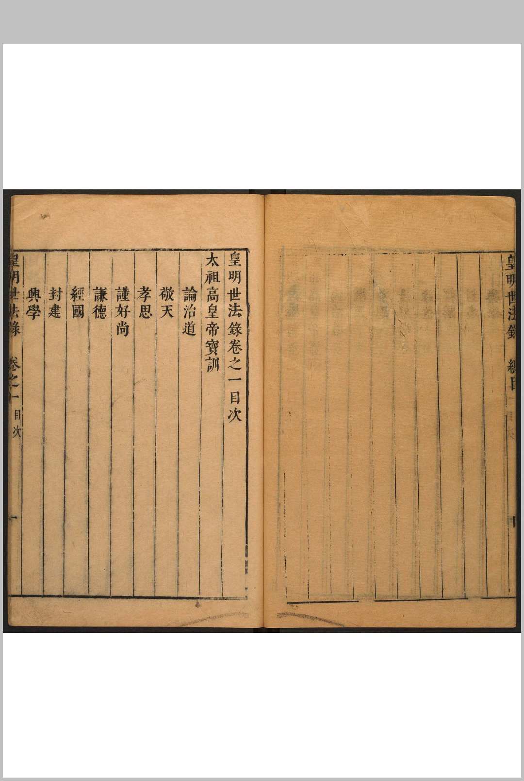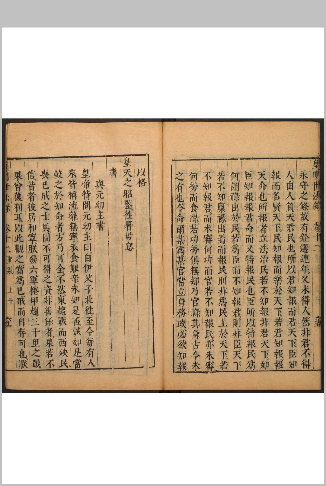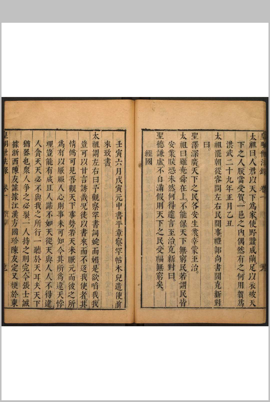 皇明,即大明,作者对明王朝的敬称。该书辑录明初至万历年间帝王谕旨、臣工奏议、朝庭大政政、典章削度,作者以为可作世代法则,故名。