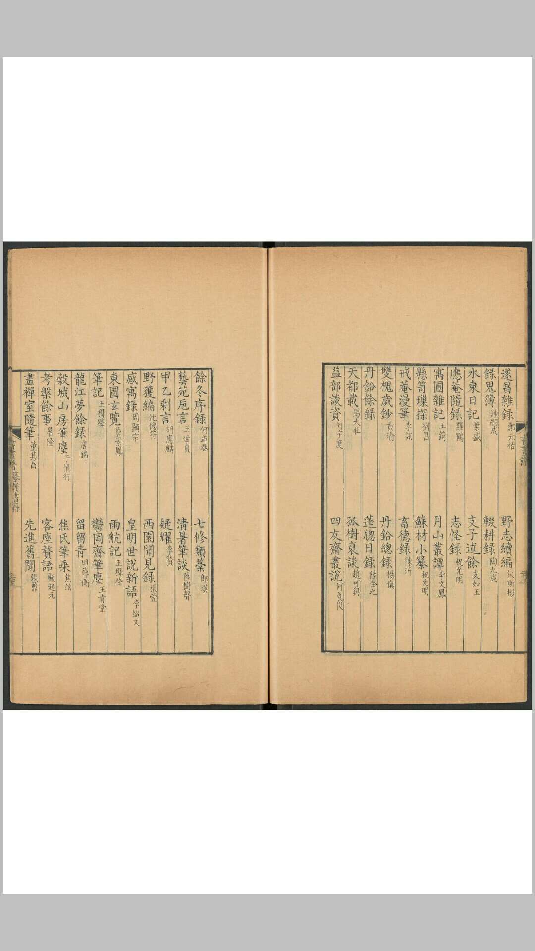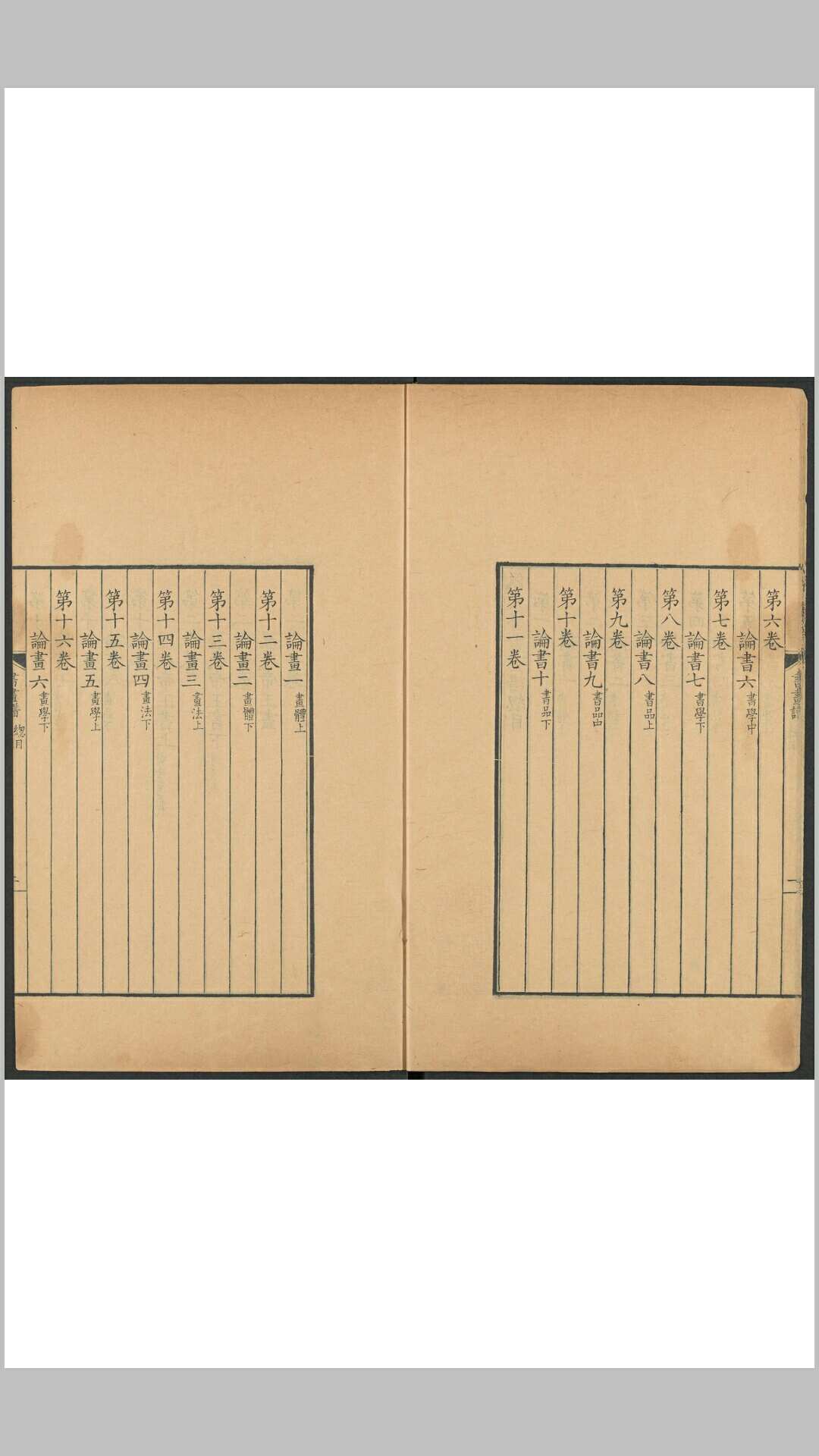 《佩文斋书画谱》是清代王原祁、孙岳颁、宋骏业、吴暻、王铨等纂辑的一部中国清代书画类书籍,共100卷。康熙四十七年(1708)成书 。计分论书、论画、帝王书、帝王画、书家传、画家传、历代无名氏书、康熙皇帝御制书画跋、历代名人书跋、历代名人画跋、书辨证、画辨证、历代鉴藏等。所引古籍1844种,其中对书画家传记的引证,均注明出处。保存了许多重要的资料,为中国第一部集书画著作之大成的工具书。
