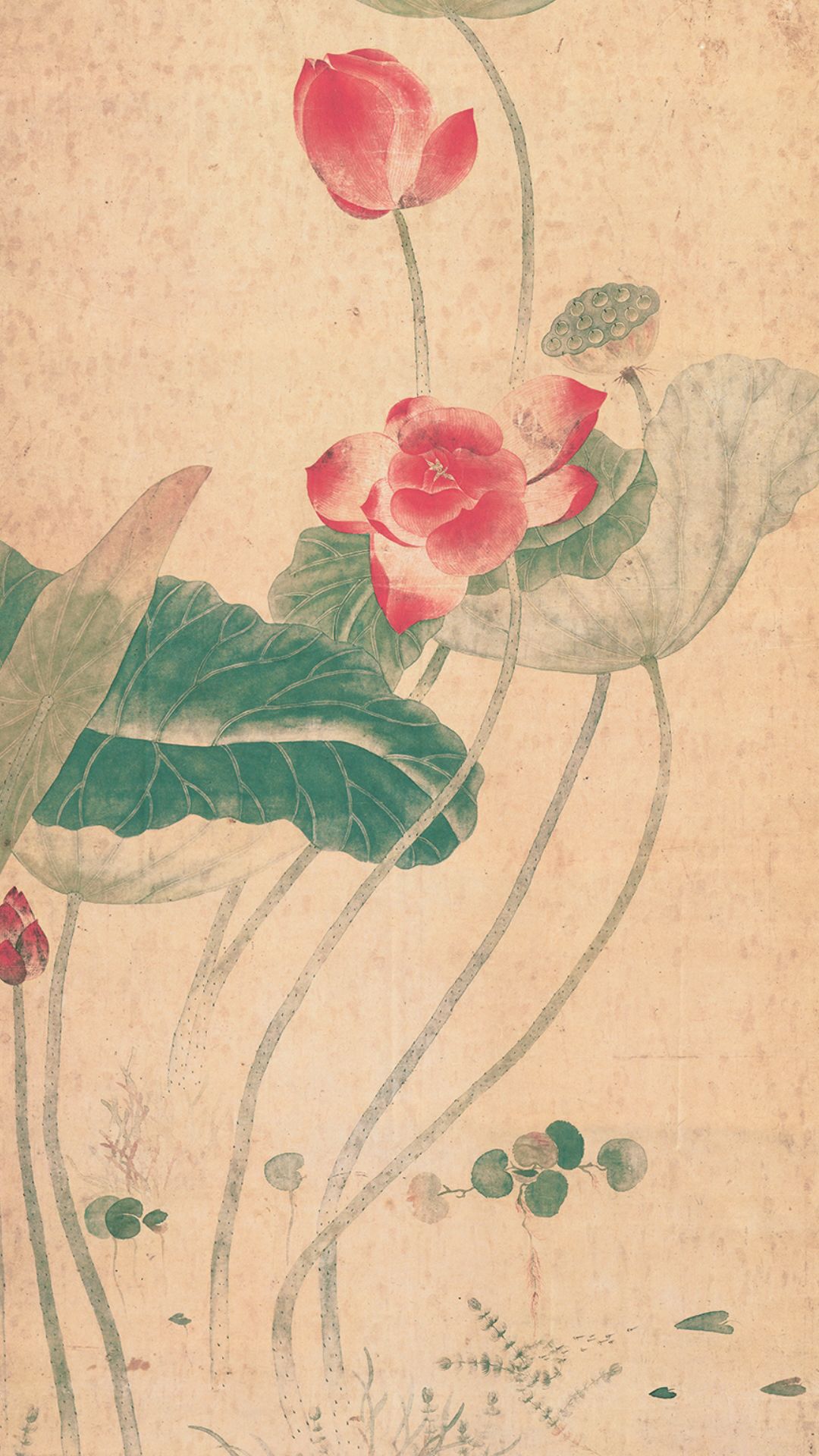 荷花在荷叶的衬托下,以含苞、初绽、怒放的三种生命形态展示着自然美。整幅运用仿恽南田笔意的没骨法,萍藻以色彩直接点就,显现出灵秀生动的物性。荷花以粉红色点染花尖,旋即以清水迅速晕开,色阶层次丰富,色调深浅过度自然,真实地展现出花瓣清淡雅丽之美以及荷花“出淤泥而不染,濯清涟而不妖”的内在神韵。