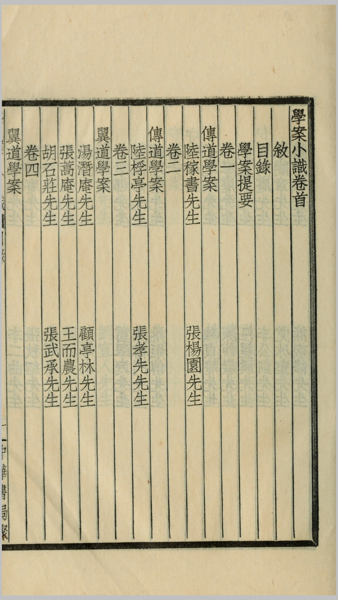 (一名《国朝学案小识》)十五卷。清唐鉴(1776-1861)著。唐鉴字镜海,湖南善化(今长沙)人。嘉庆进士,由检讨官至江宁布政使,人为太常寺卿,卒谥确慎。学宗朱熹,反对阳明学说,曾主讲于金陵书院。此书草创于道光二十三年(1843),成于道光二十五年。仿黄宗羲《明儒学案》、《宋元学案》之例,把清代讲学诸儒分立《传道学案》、《翼道学案》、《守道学案》、《经学学案》、《心宗学案》等五学案。《传道学案》二卷、列陆陇其、张履样、陆世仪、张伯行四人,以为正宗。此四人心程未之心,学程朱之学,上追孔、曾、思、孟,下接许、薛、胡、罗传古圣贤之遗绪于不坠。《翼道学案》五卷,列汤斌以下十九人,言足以匡迪群流,行足以羽仪四海,举偏颇而扶中正,祛迷罔而□诚明,得所翼而道不孤,道不孤,则乱道者不能夺其传。《守道学案》四卷,列于成龙以下四十四人,又附列一人,坚定以立其志,严肃以持其身,得所守而道益明。《经学学案》三卷,列黄宗羲以下一百零四人,又附列四人,由穷理而得圣人之旨,道不离于经,经不离于道,所列虽多汉学家,然以不离于道为宗旨。若但训诂其文字,考索其典章,重名物,不重心身,知猎取,不知格致,则为字里行间之经,非道德性命之经。《心宗学案》一卷,列张沐以下三人,为非学而足以乱学者。《守道学案》后列《待访录》二卷,列应□谦以下六十八人,《经学学案》后亦有《待访录》,列张惠言以下八人,《心宗学案》后《待访孙》列邵廷采以下六人,皆为未见其原著,只见于他书所称引者。全书共列清初至嘉庆间学者二百六十一人,各为之传,记其生平、学术渊源、学术思想、主要著作。每传后附同学或从游者、问答者。全书大旨在“道”字,扶持程朱理学,谓宗朱子为正学,不宗朱子即非正学。表彰传道、翼道、守道、穷经诸儒之功,对墨守程朱理学的陆稼书等人推崇备至,辨王阳明心学“阳儒阴释”之非。全书除《经学学案》叙汉学外,其余均叙理学,即《经学学案》.所列,亦以不离于道为宗旨。此书门户之见甚深,使此书几乎成为一部理学或道学学案,所取树亦不甚完备。以其所见不广之故。但毕竟为清代第一部专为清儒立案的学案体清代学术史,为后世学者所取资。对经学者学术观点的介绍较为详细。