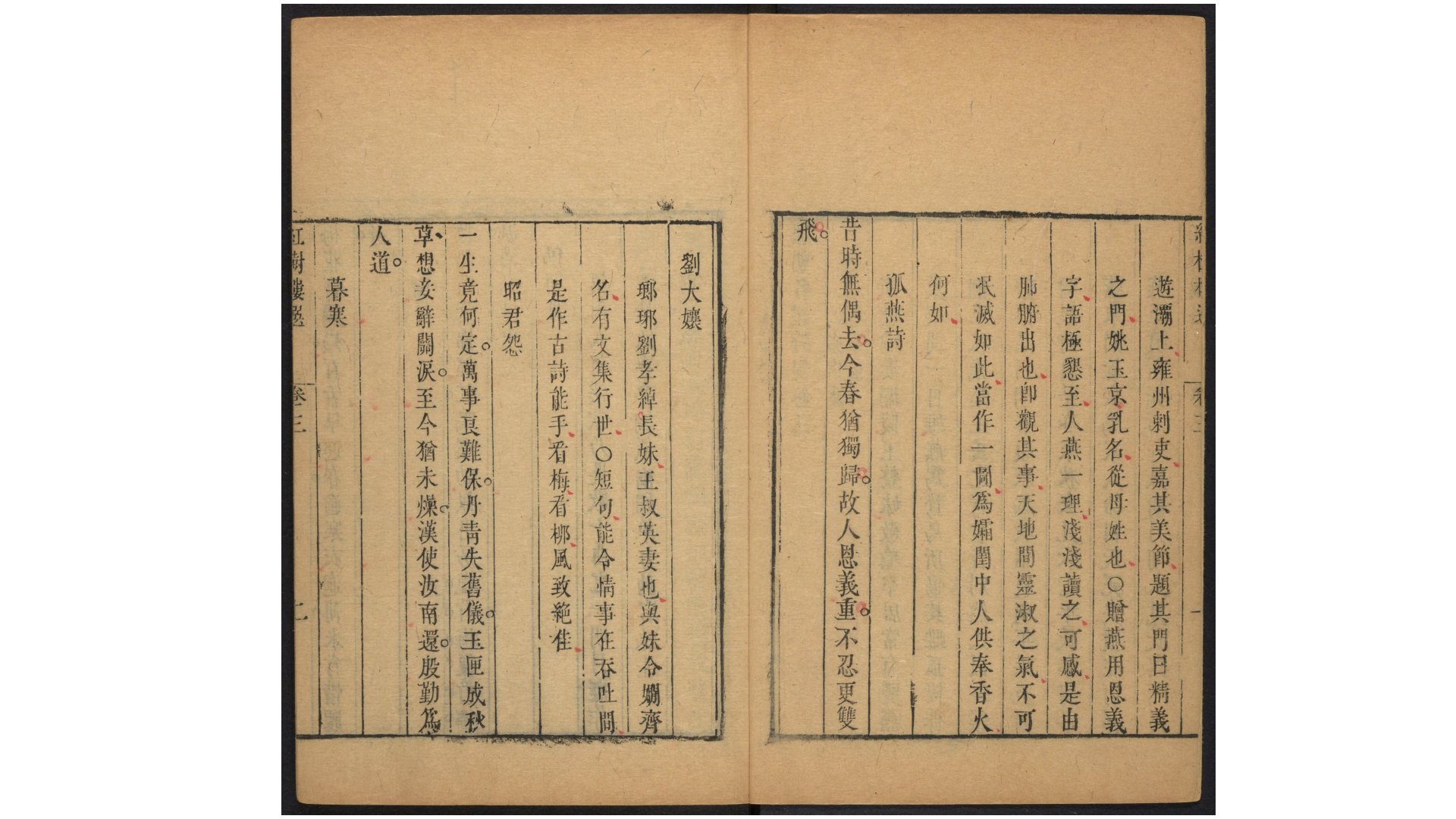 此《历朝名媛诗词》为清代陆昶评选。全书共十二卷,内收王嬙、蔡琰、鱼玄机、薛涛、李清照等汉至元间两百余位名媛的诗词,共六百九十八首,以诗存人。诗词前附名媛绣像(共约五十七幅),又叙小传。此为红树楼藏板,清乾隆三十八年刊本。