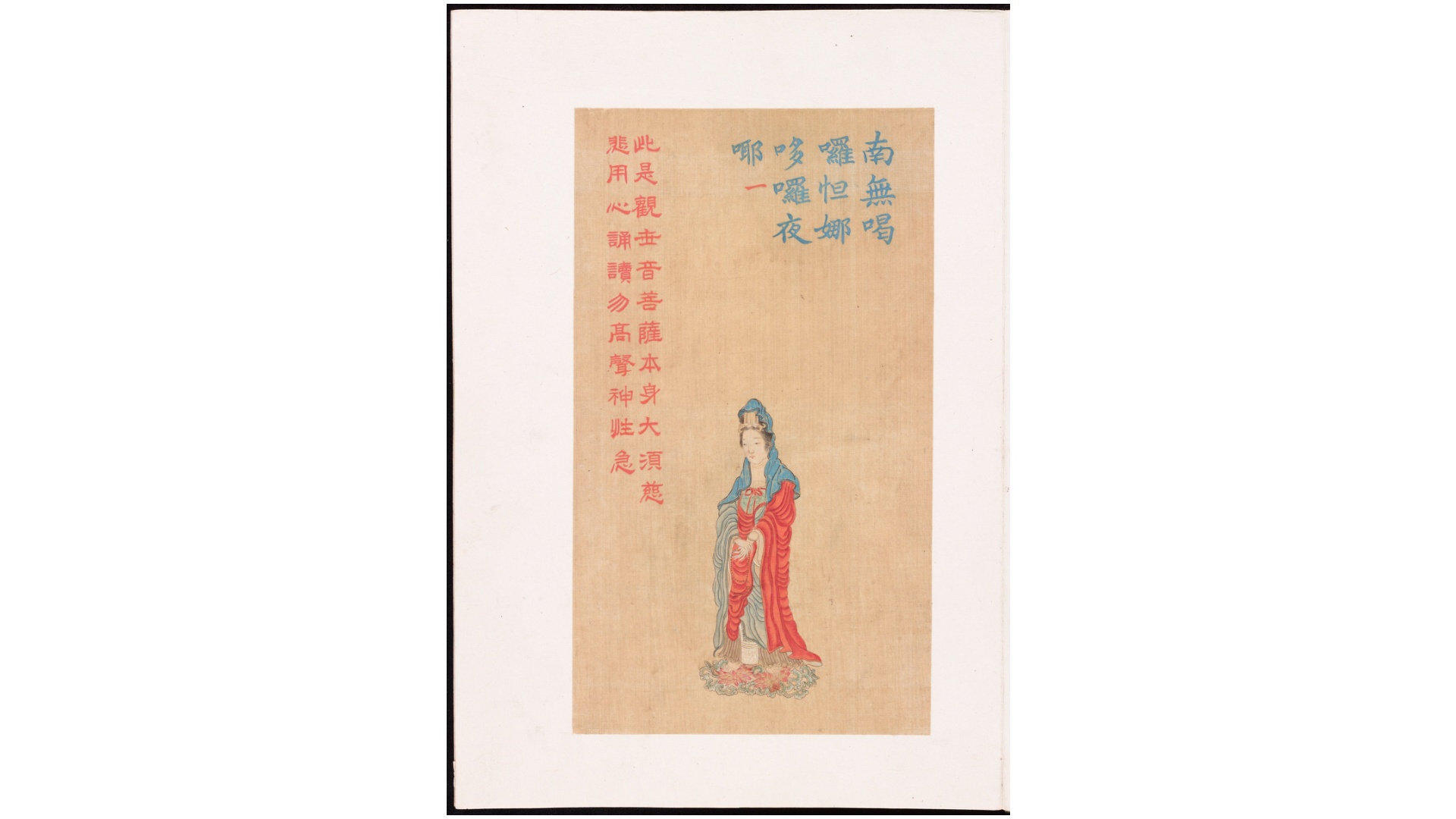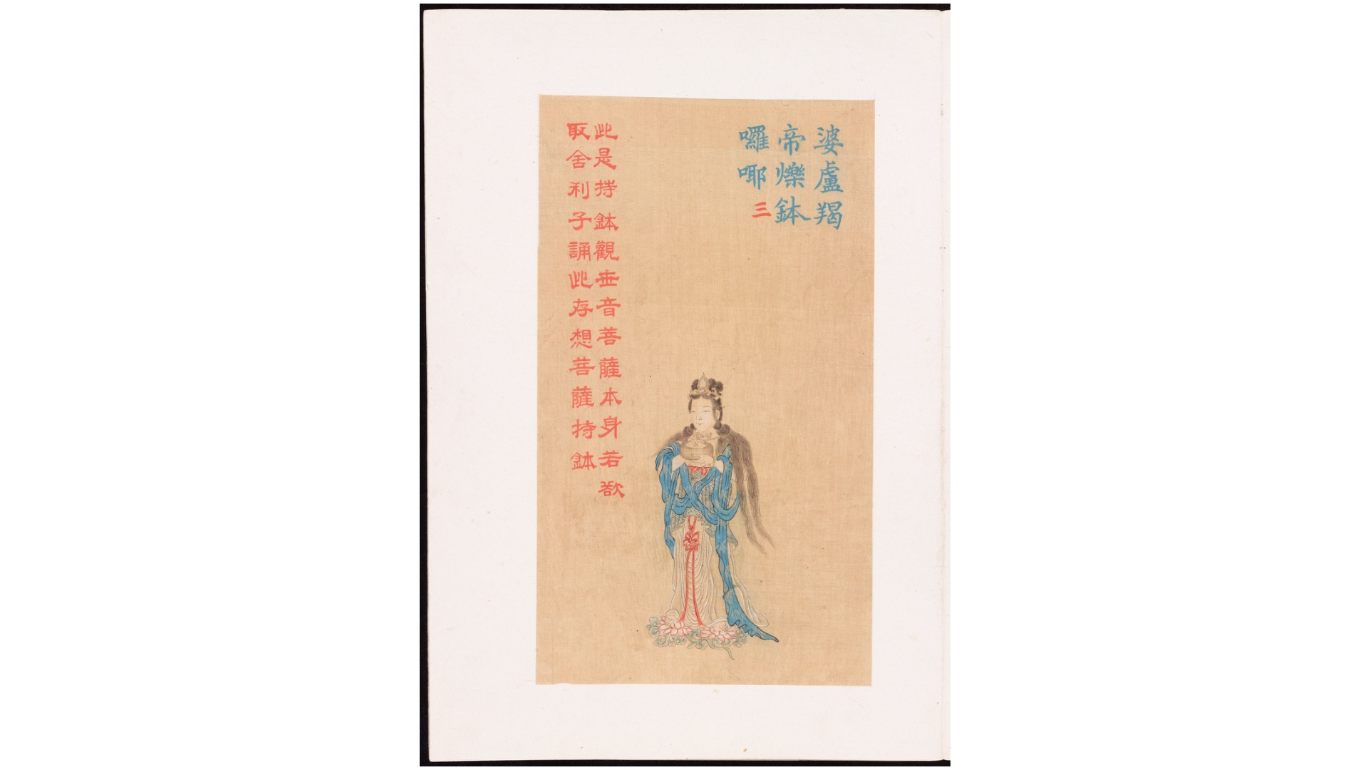 此本《工细大悲神咒佛像》(大悲咒出相图)上下册描绘的了大悲咒语前43句及图解,末页是护法韦驮尊天菩萨。书中一句一像,经文用青蓝色书,释文用朱红色书。此本为清代彩绘绢本,作者不详。