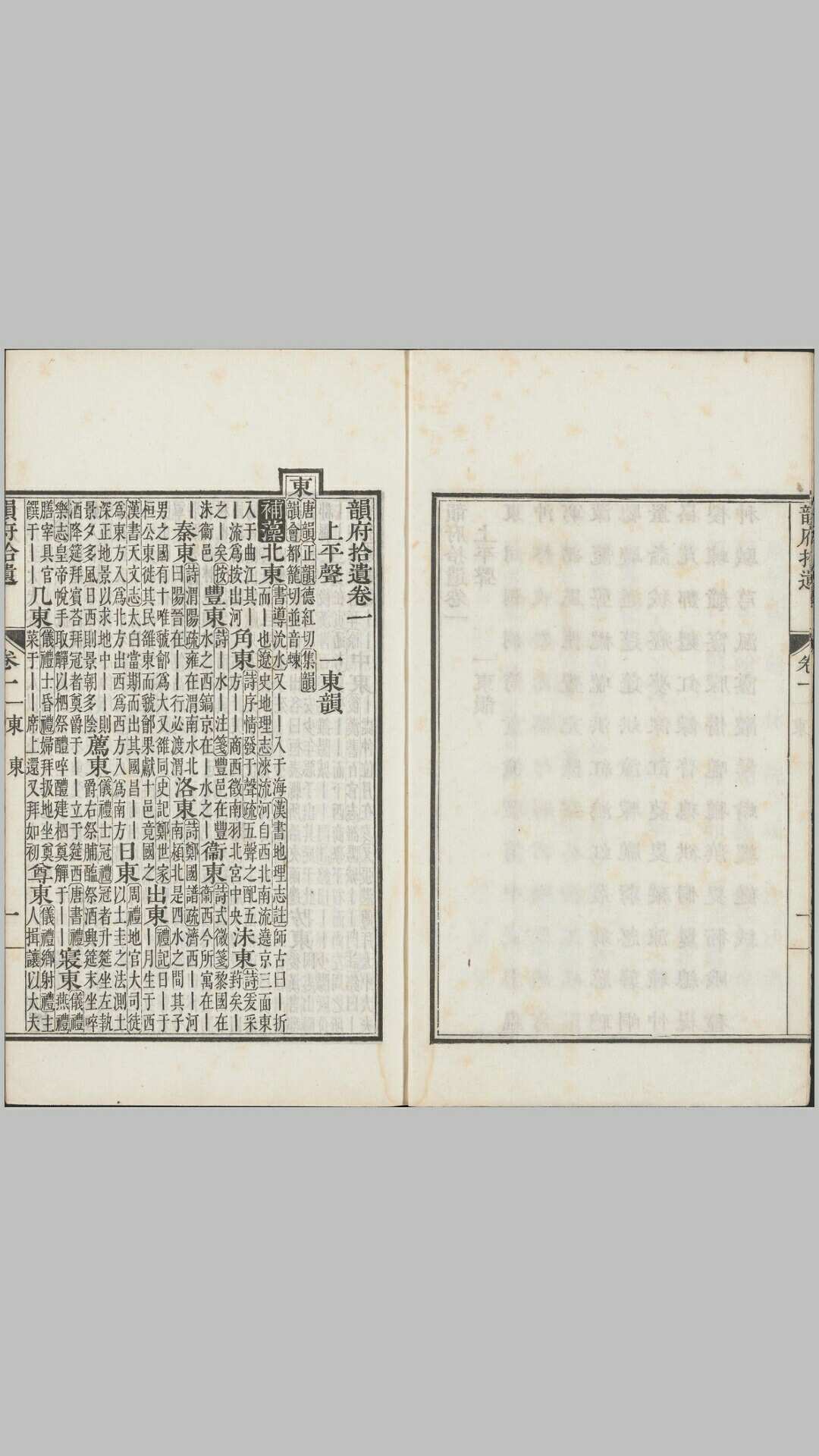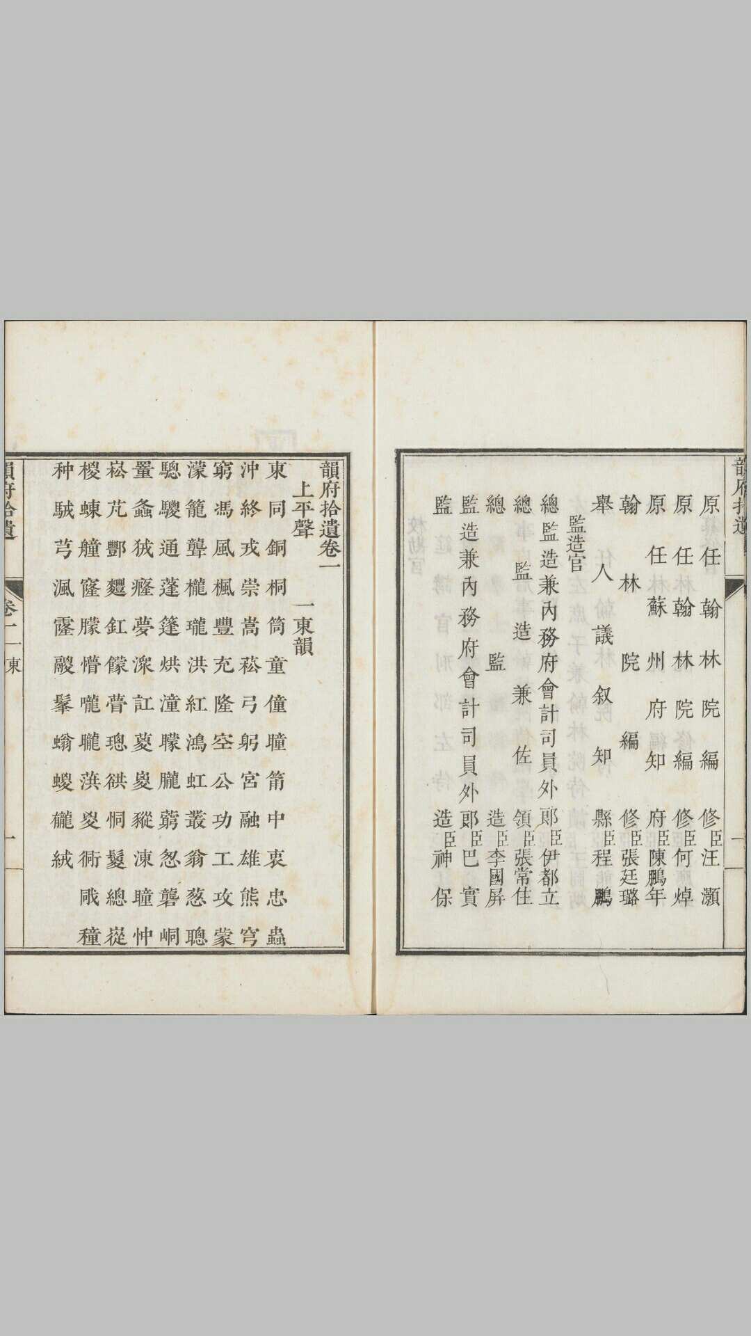 《佩文韵府》是清康熙帝命张玉书、陈廷敬、汪灏等二十余人编纂的一本韵母词典。全书共分正编、拾遗各一百零六卷,按平水韵一百零六韵排列,是中国依韵排列规模最大的词典,全书收单字一万九千多个,典故大约有五十多万条,诸多文章典故均辑录于此书。此本为清康熙时期內府合刻本,佩文是康熙帝的书斋名。