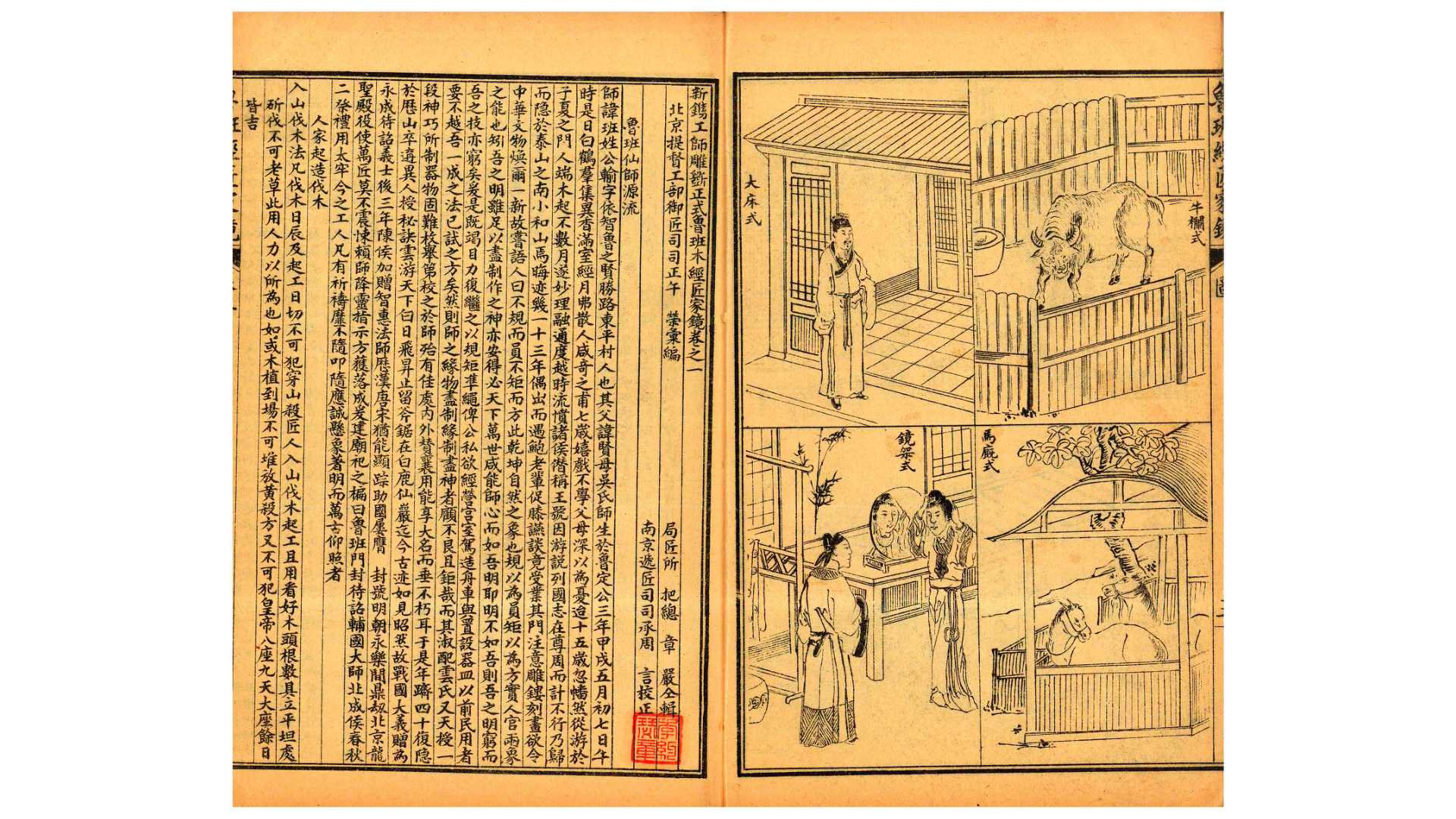 鲁班经原名《工师雕斵正式鲁班木经匠家镜》或《鲁班经匠家镜》,午荣编,成书于明代,是一本汉族工匠的业务用书。全书有图一卷,文三卷。《鲁班经》介绍行帮的规矩、制度以至仪式,建造房舍的工序,选择吉日的方法;说明了鲁班真尺的运用;记录了常用家具、农具的基本尺度和式样;记录了常用建筑的构架形式、名称,一些建筑的成组布局形式和名称等。