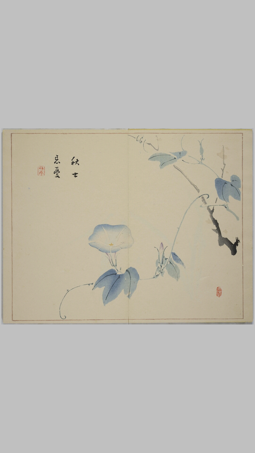 此木板水印画集《丹青一斑》,作者是日本明治时期著名画家滝和亭,他曾从清人陈逸舟学习明清书画,精通中国画。此本共五册,收录其作品:花卉、瓜果、草虫、禽鸟、竹石、屋舍、山水、人物等木板水印画作60幅,设色淡雅、秀美清妍。此本为明治27年(1894)芸草堂刊本。