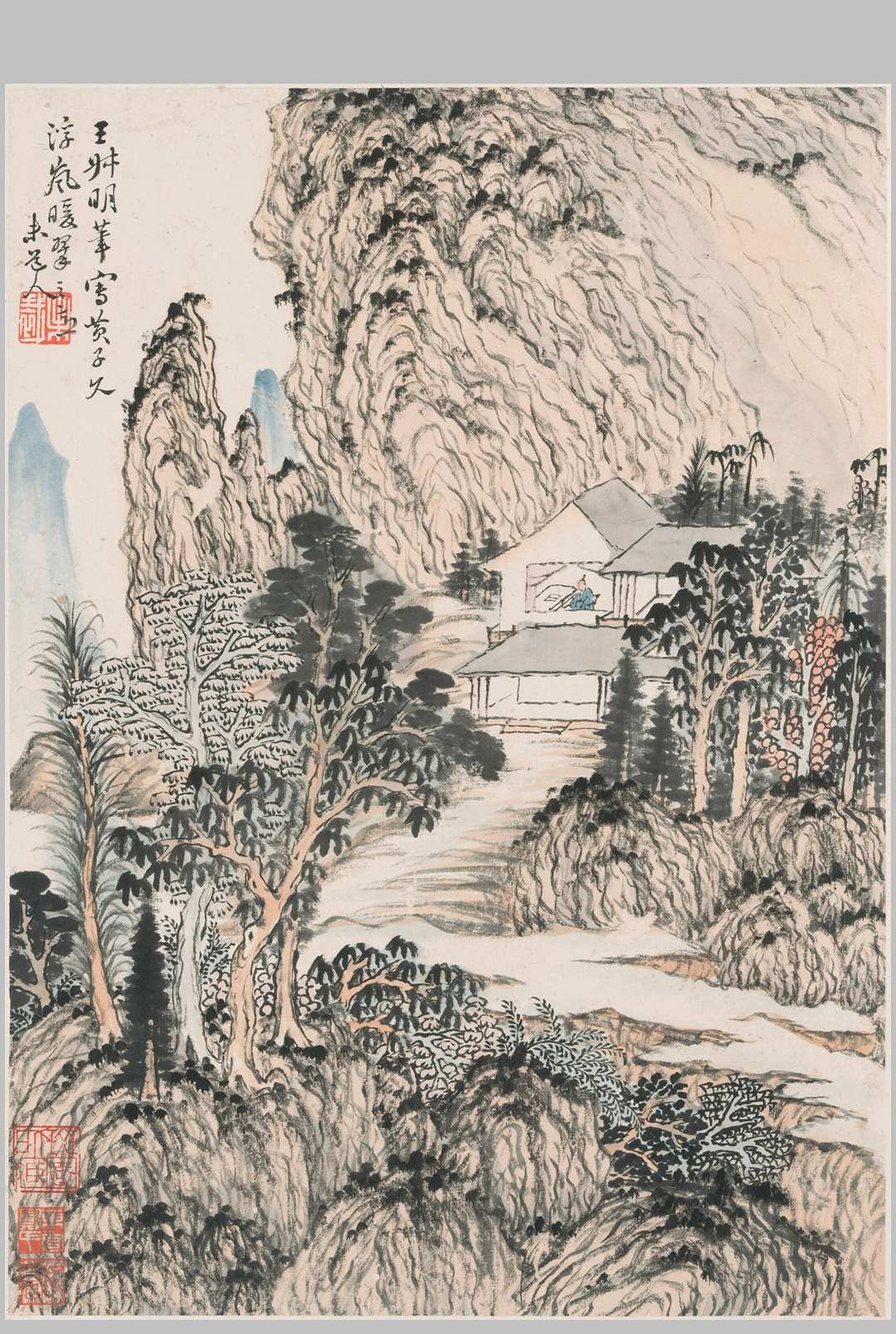 此套册页作于乾隆五十四年,黎简时年四十三,形式上类似明清时期的仿古山水,反映黎氏画法的主要渊源,包括董源、米芾、王蒙、黄公望等。虽然只有第一开谈到石涛,但事实上全套八幅都展示石涛风格的极深影响。湿笔浓墨、浅绛设色,加上稍微古拙的树石或人物造型等,皆来自石涛的典型特色。黎简自称画学在四十多岁以后才感到略有所得,此册是其画中精品。此幅现藏于香港中文大学文物馆,纸本水墨设色。