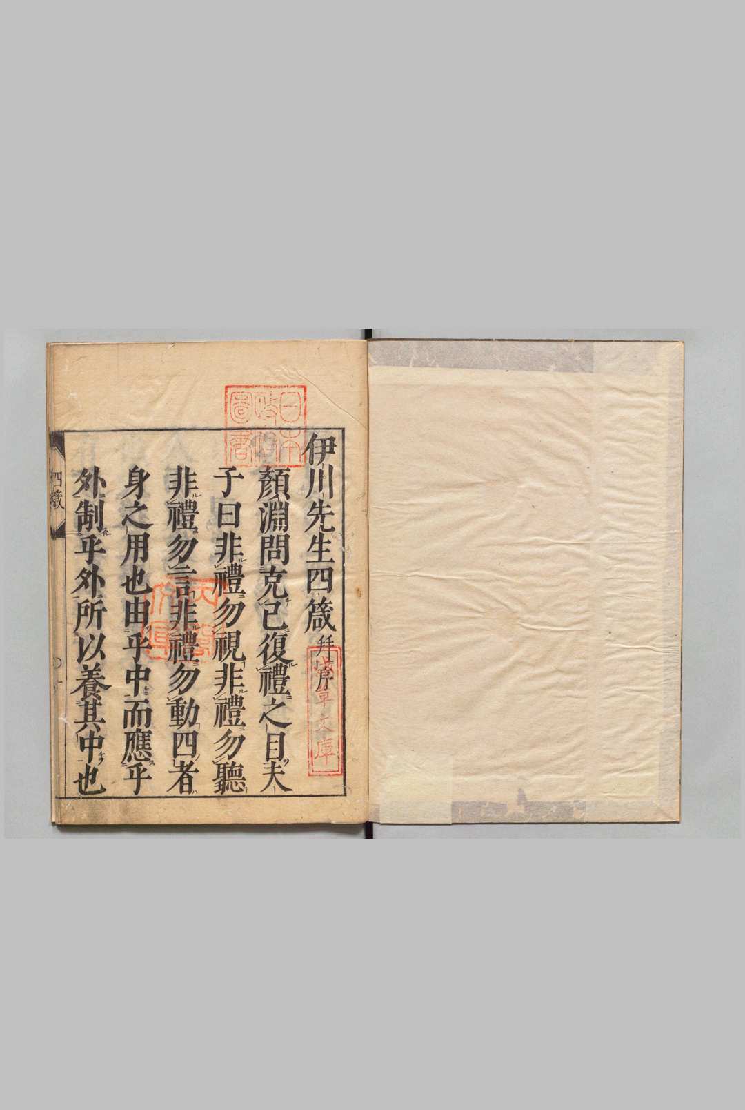 “四箴”即宋代理学奠基人程颐所撰视、听、言、动四箴。明世宗推崇理学,亲注“四箴”颁行天下学校。现存“四箴”为明嘉靖年间所刻,内容包括“四箴”和世宗注解。“视听言动”四箴是程子对孔子“非礼毋视,非礼毋听,非礼毋言,非礼毋动”“四毋说”的进一步阐发,也表明理学家对日用言行及修养的重视,他们认为只要视而能察、听之能审、言而有道、动能守诚,就能够达到与圣贤同归的境界。