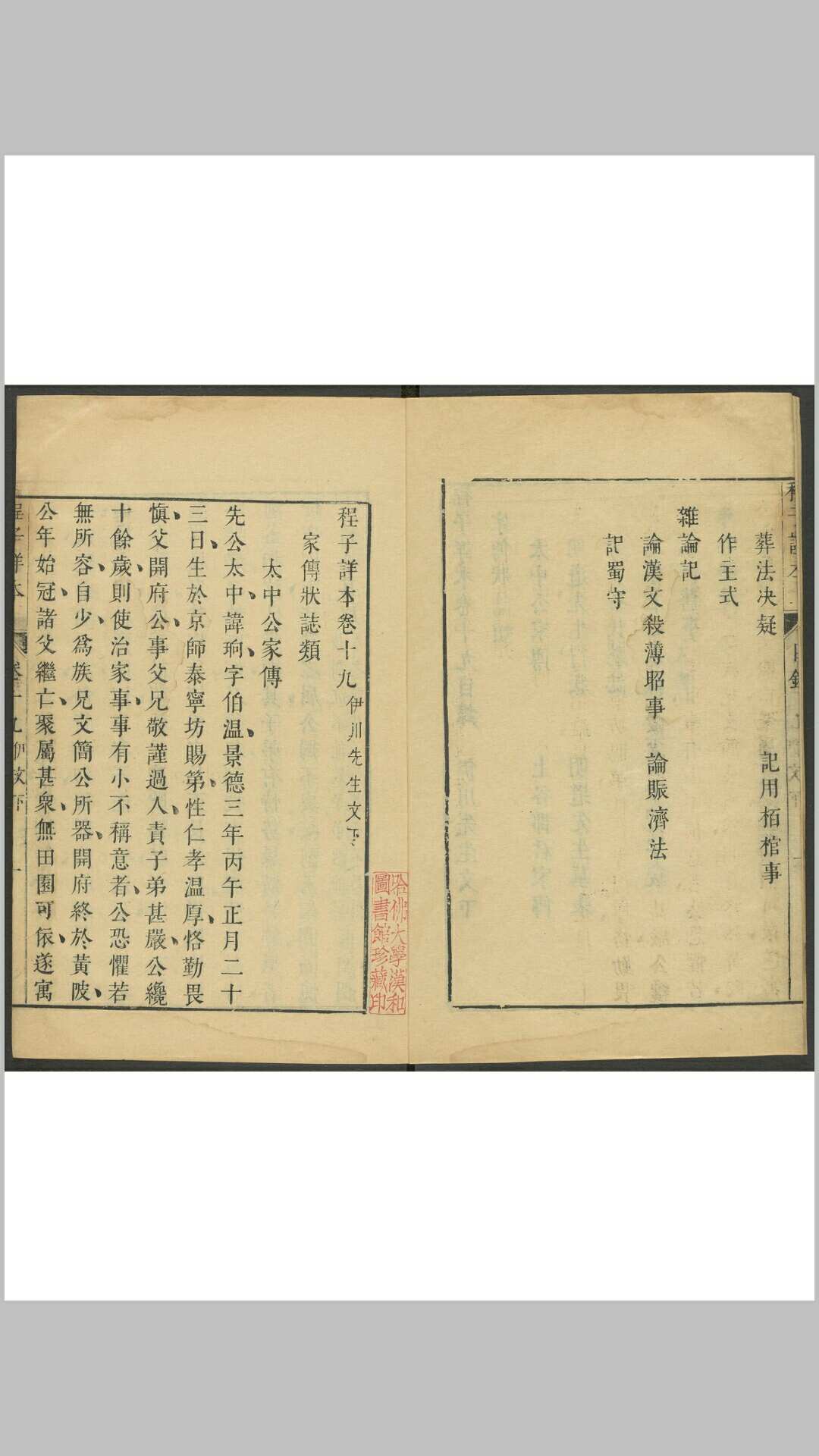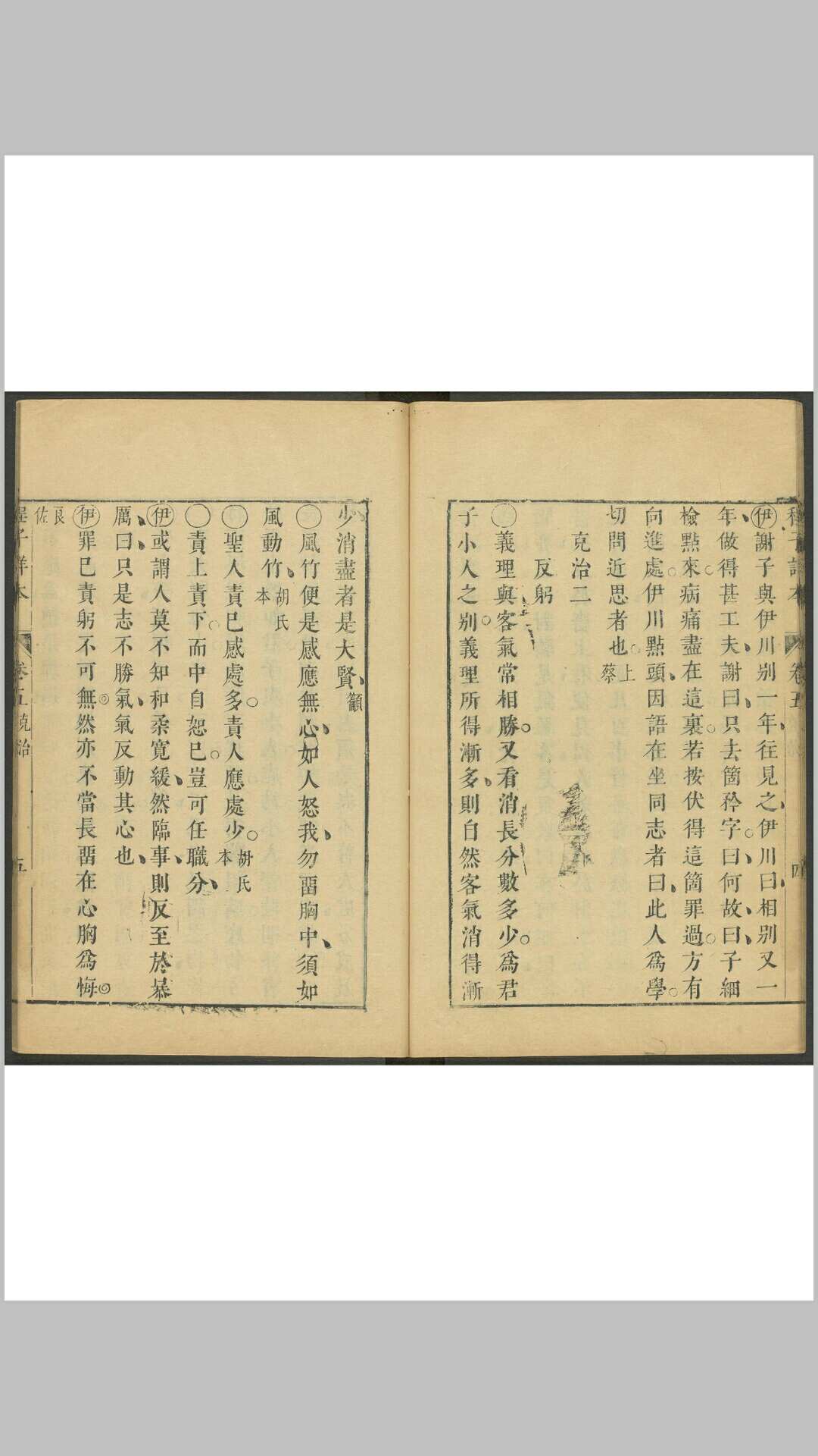 二十卷。明陈龙正(详见《救荒策会》)编。龙正以二程遗书虽经朱熹手编,而记载之重复、字句之同异及议论之出入,均未暇是正,遂排比刊削,分类编次,定为此本。其经说之别者,亦并载入,又增以元谭善心之传闻续记。其自序云,视全书颇约,而实不敢不加详,故不曰约本而曰详本。其间于二程之说多所辨驳,《四库全书总目》谓其“不出明末讲学家诟争之习”。《四库全书总目》有该书存目。