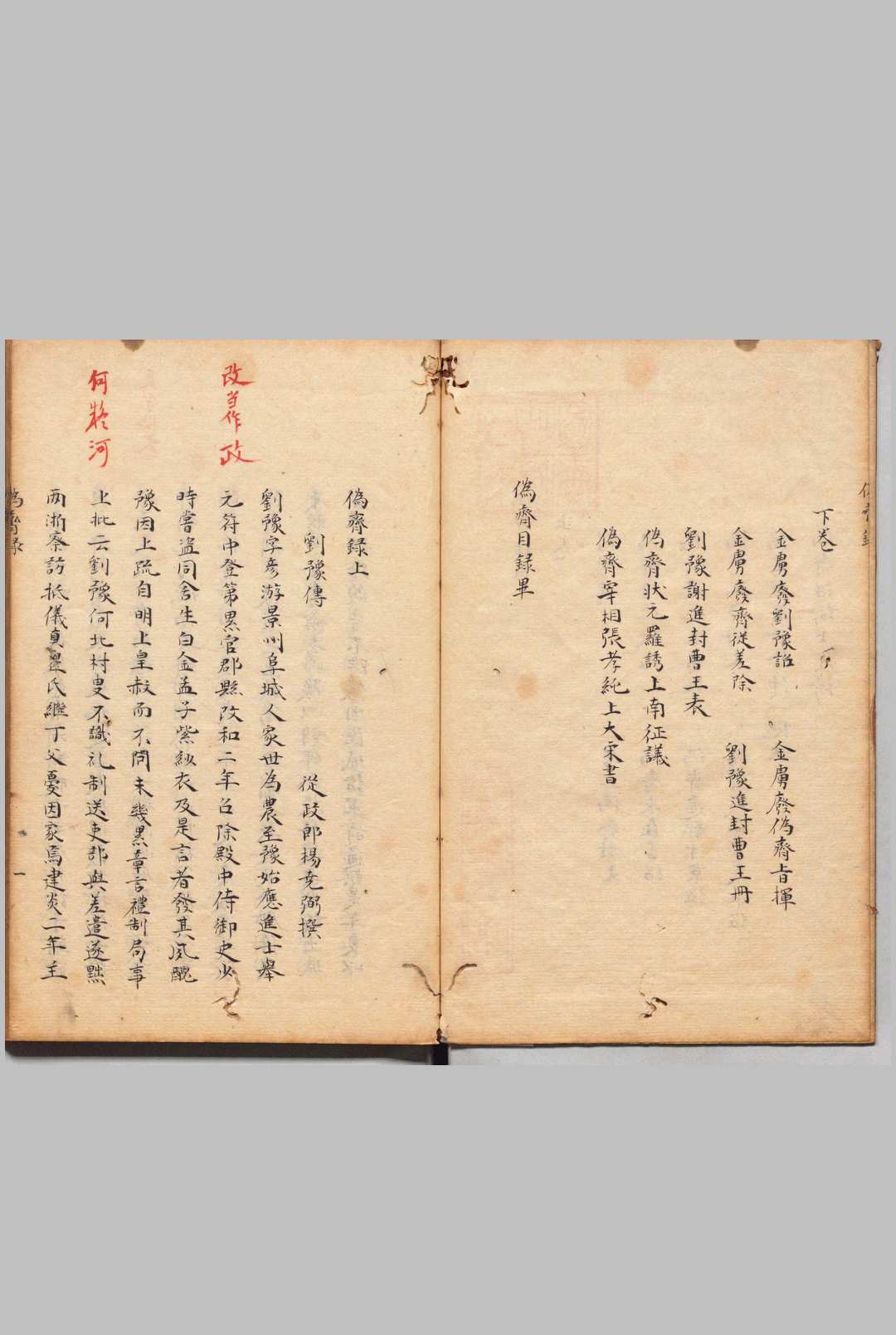 二卷。不署撰者名。缪荃孙据《北盟会编》题为从政郎杨尧弼撰,且称大概为南宋人的著作,因为书中出现赵构的名字,注解中就“指斥御名”。该书记载刘豫伪齐史事,刘豫见于《宋史·叛臣传》。