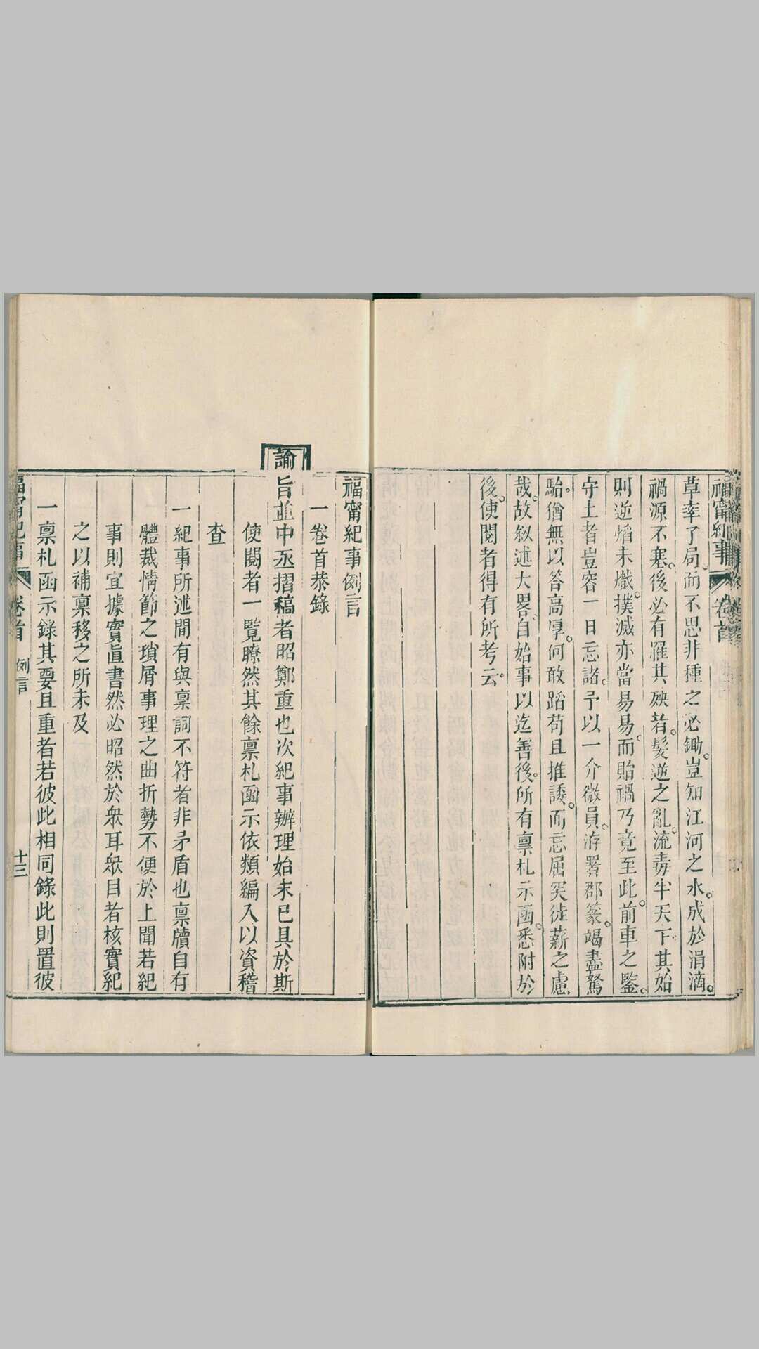福宁府是清朝时设置的府。 清雍正十二年改福宁州置,治所在霞浦县,属福建省。此套丛书含清同治初年福宁知府程荣春撰:《福宁纪事》两卷附卷首、《福宁从政纪略》、《泉州从政纪略》、《战车练砲图说辑要》三卷(内含:长枪图二十势、单刀图二十势)、《简练集》。此为清同治时期程氏吟雨楼刊本。