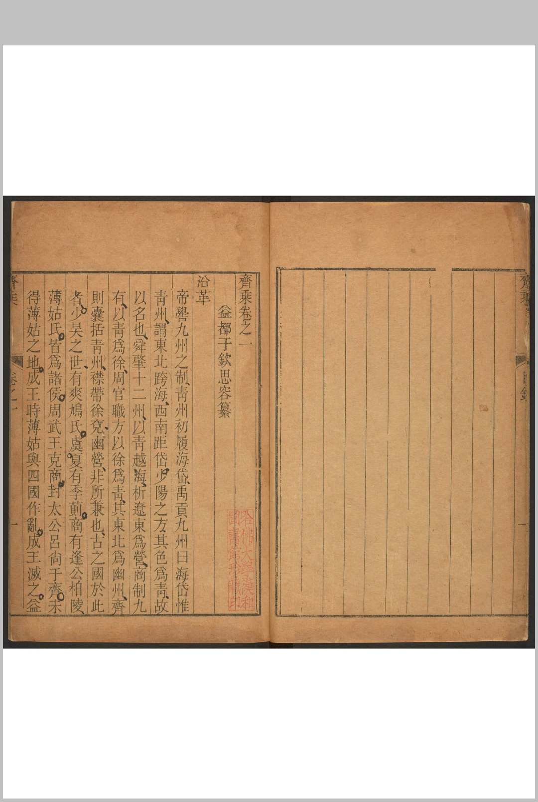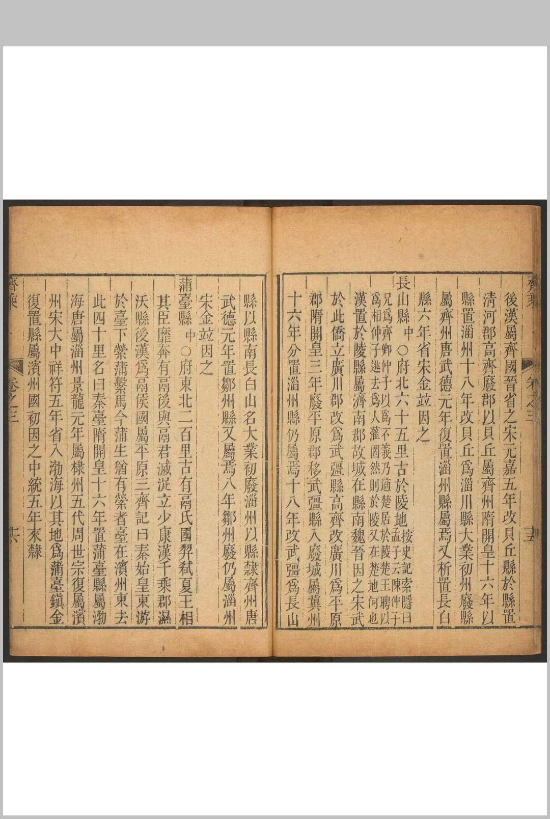 《齐乘》共六卷,分沿革、分野、山川、郡邑、古迹、亭馆、风土、人物等八门。书前有至元五年(1339年)时任江北淮东道肃政廉访使苏天爵序,末附有于潜所作的跋、释音一卷。该志专记三齐舆地,所记以当时山东东西道所辖益都、般阳、济南三路并德州为主,并附古代曾为齐邑的高唐、禹城、长清、聊城、东阿、阳谷、临邑、齐东等县。除元至正刻本外,该志还有明嘉庆刻本及清乾隆刻本,乾隆刻本增附周嘉猷所作考证六卷。