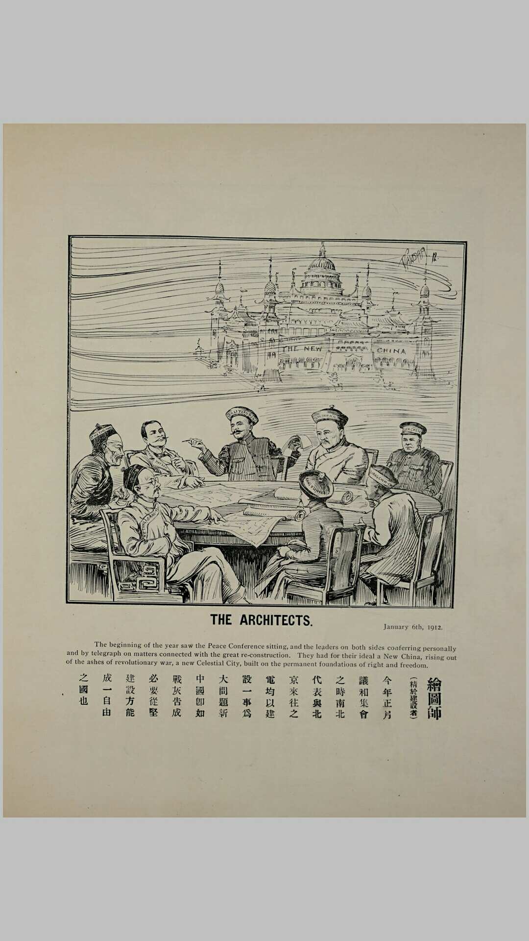 《一千九百十二年中国历史插画伍拾二幅》(The history of China for 1912 in 52 cartoons)由中国公论西报编刊。全书以中英文介绍了民国元年(1912)的时事政治话题,并分别配以版画插图(共五十二幅)。此书于1913年在上海出版。