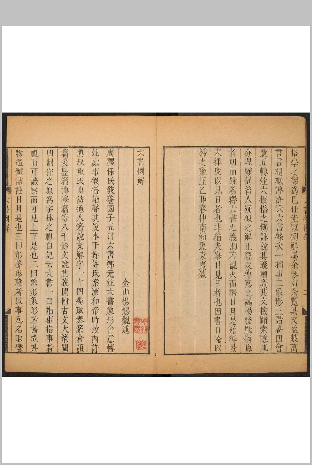 《六书例解》是中国的一部古书籍,属于文言文。国朝杨锡观撰。书凡六篇,分论六书。附《六书杂说》·一卷、《八分书辨》·一卷(浙江巡抚采进本)