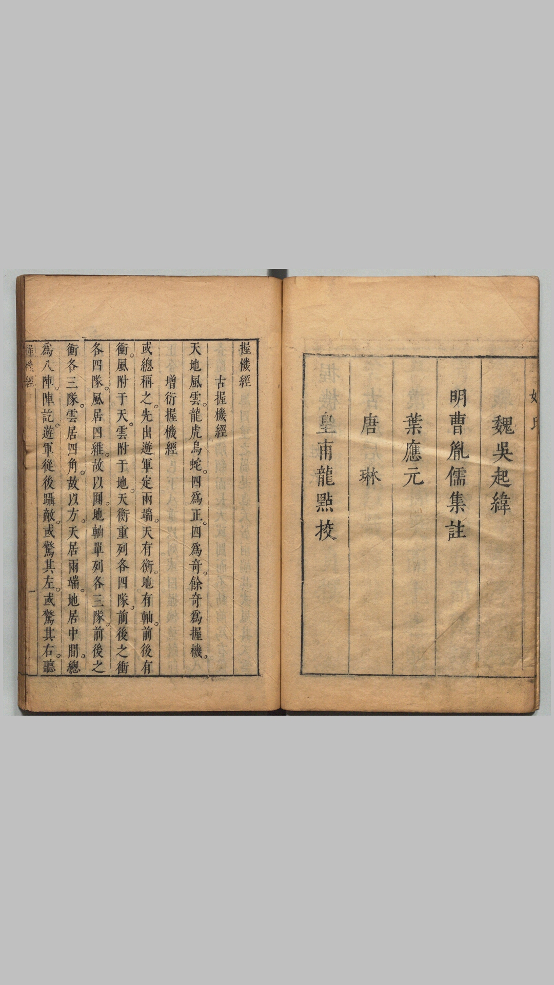 此《握机经》《握机纬》合刊本由明代曹胤儒辑,全书共含两种:握机经(三卷,内容是关于八阵布列的兵书,内收多幅阵法图)、握机纬(十五卷:内含《孙武子》十三卷、《吴子》两卷),书前有王世贞序。此本大致为明天启年间刊本。