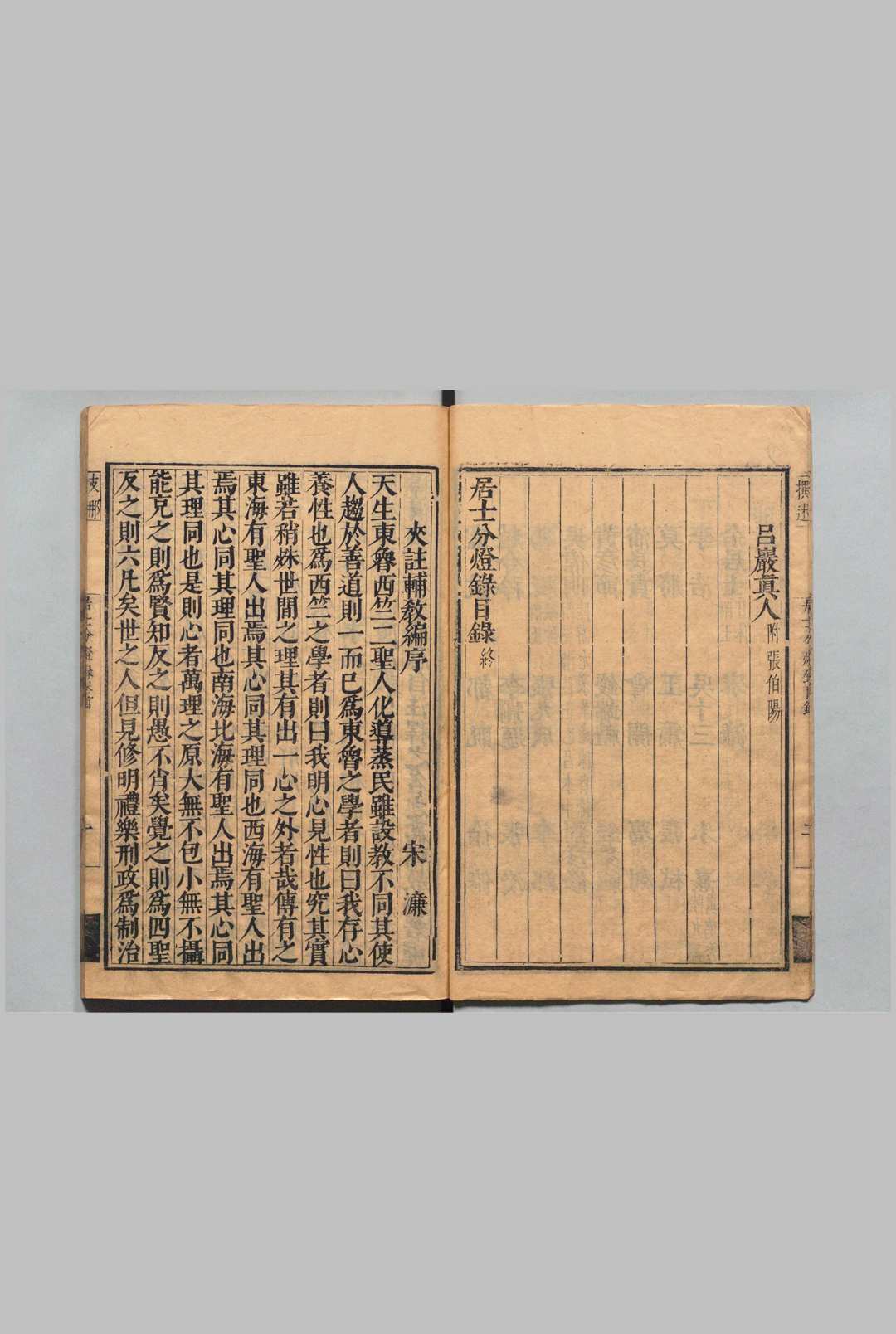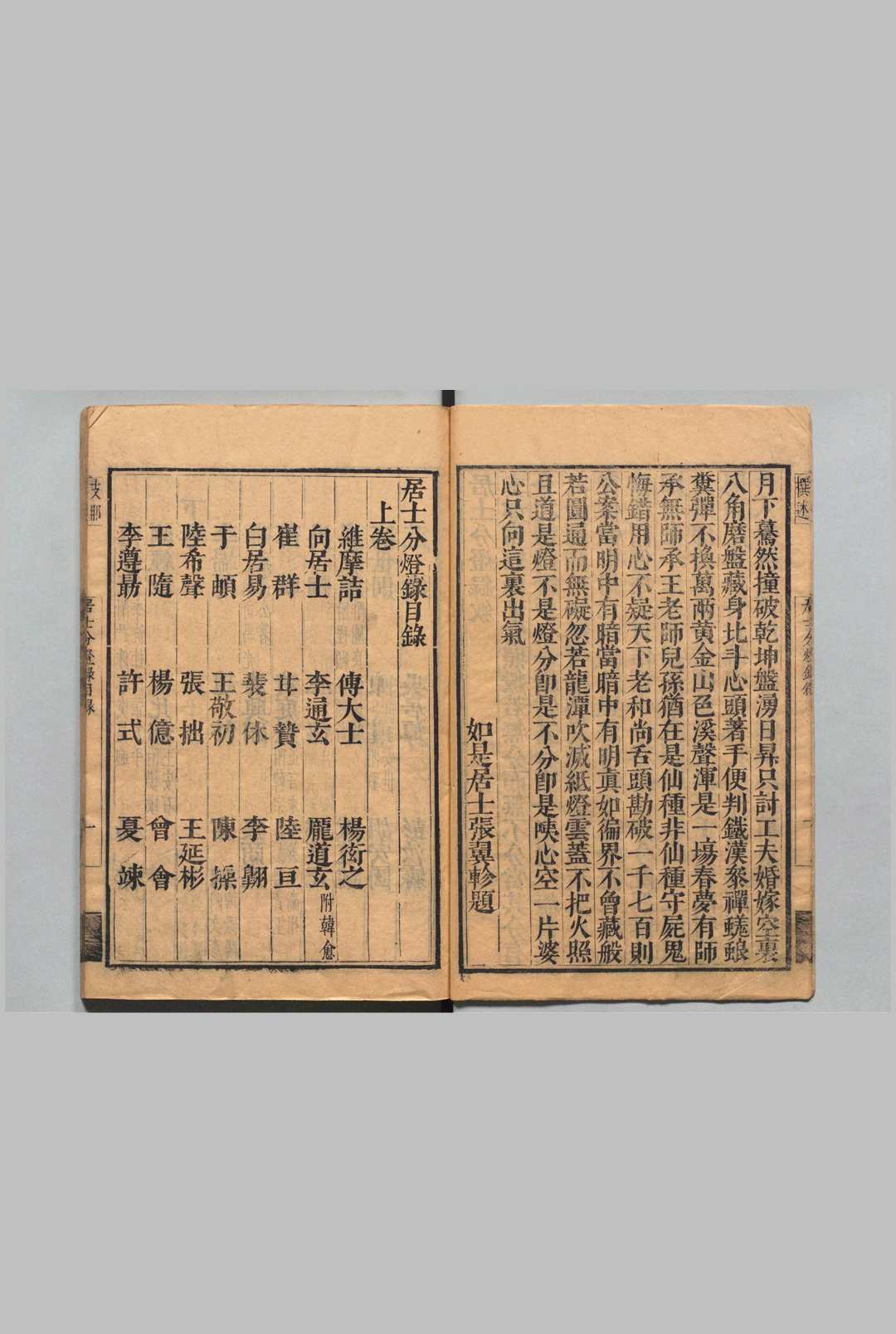 凡二卷。明代朱时恩辑。书成于崇祯五年(1632)。收于《万续藏》第一四七册。此书仿效缁门之传灯录,辑录在家信众参禅办道之事缘。包括西土之维摩居士,唐代之傅大士、庞居士、韩愈、吕岩真人,宋代之苏东坡、朱熹,及明代之宋濂等,计有一一○人。