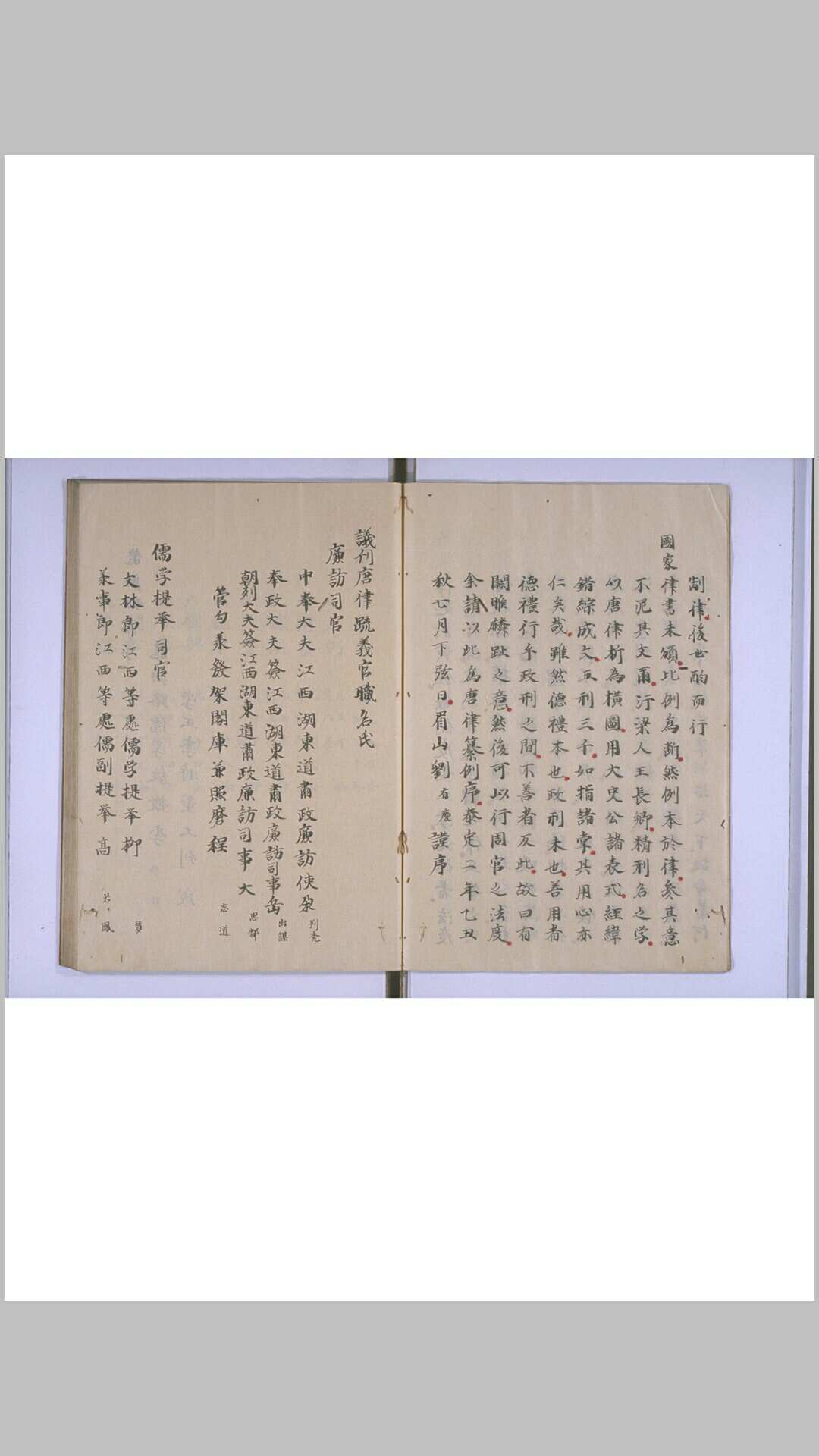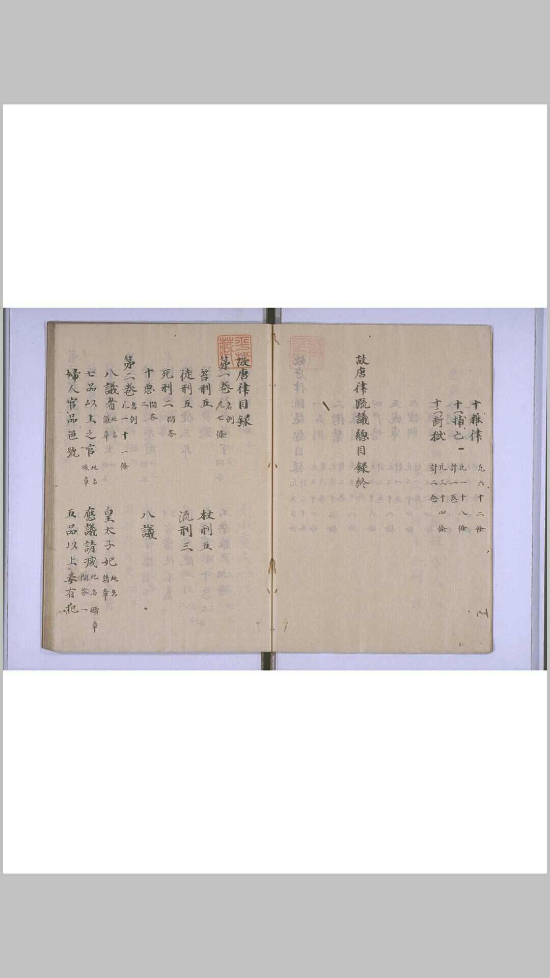 唐初统治者曾在隋朝《开皇律》的基础上修成了一部《唐律》。至高宗时又命长孙无忌等人对律文逐条解释,撰成《唐律疏义》一书,共30卷。此书今存,是我国古代流传至今最早最完整的一部封建法典。该书记载《唐律》共有名例、卫禁、职制、户婚、厩库、贼盗、斗讼、诈伪、杂律、捕亡、断狱等12篇,笞、杖、徒、流、死5种20等刑名,共502条律文。