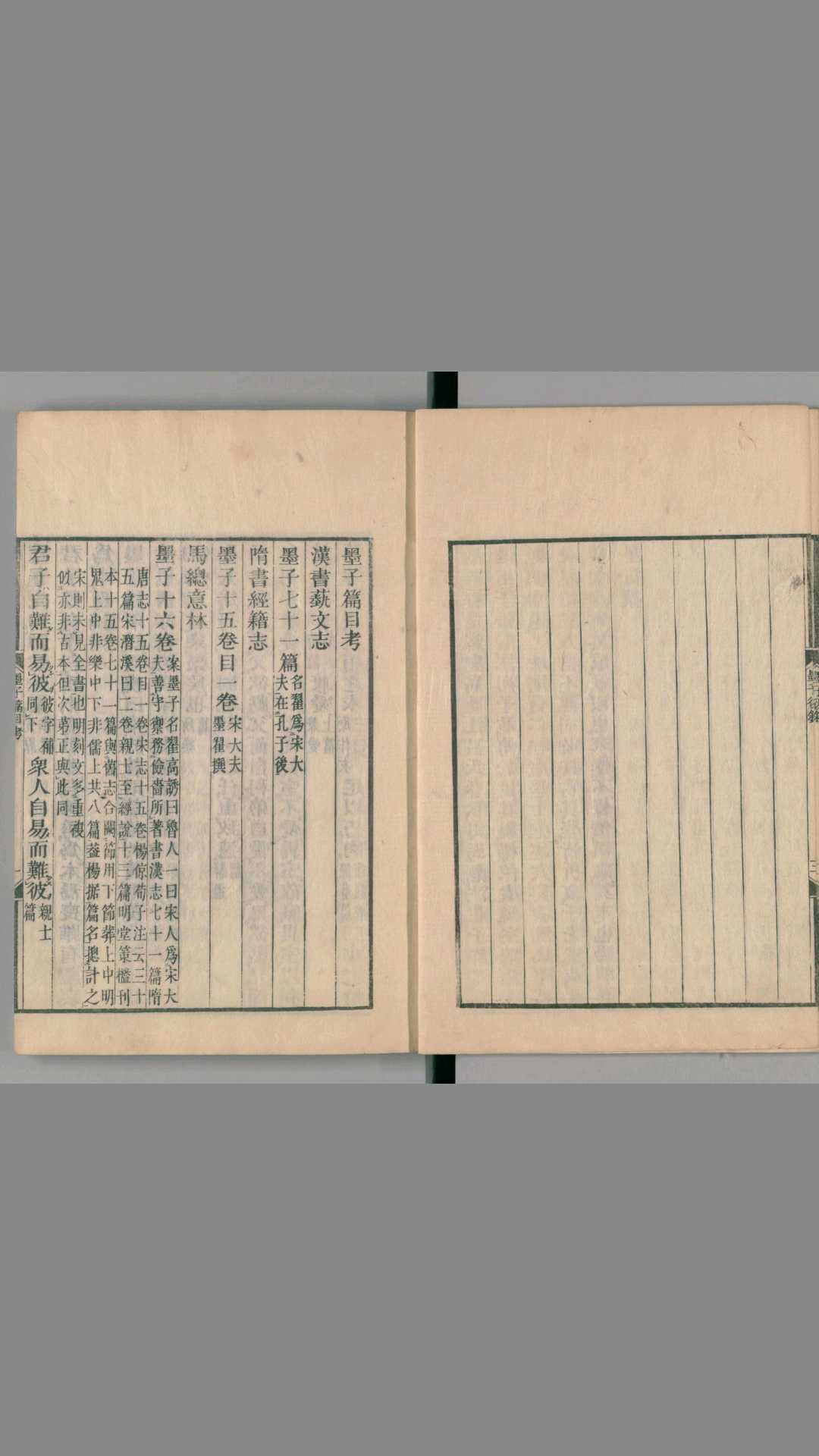 《墨子》为战国百家中墨家的经典。墨子提倡兼爱、非攻、尚贤、尚同、天志、明鬼、非命、非乐、节葬、节用,对哲学、逻辑学都有研究和贡献。此外,他在军事学、工程学、力学、几何学、光学上都有相当的研究和贡献,先秦的科学技术成就大都依赖《墨子》以传。现存《墨子》一书,由墨子自著和弟子记述墨子言论两部分组成,后世多散佚。至清代编《四库全书》时,仅存五十三篇。