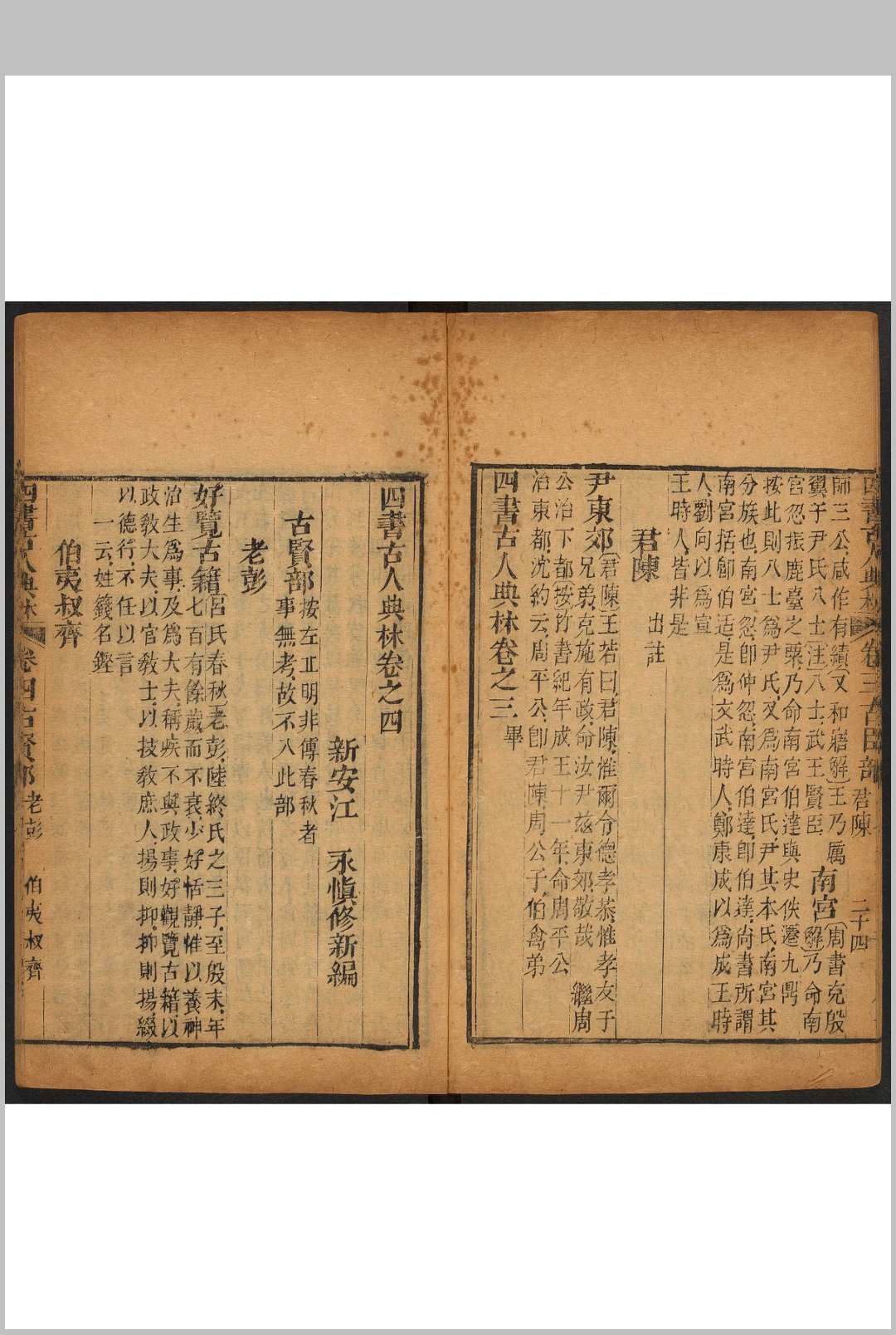 是书分帝王、古贤、圣贤、诸侯、大夫、杂人、列女各部,凡二百余人,大旨为举业而作,但跟坊行诸本迥然有别。向来援引错谬,江永都一一为之订正删削,其中尤其重要者,如孔子事迹,江永并详加考核,使此后注家奉为定论。卷首有江永自序,卷后有门人汪澎跋。是书系江永绝笔,可视为《四书典林》的补充。该书有乾隆三十九年(1774)刊本。