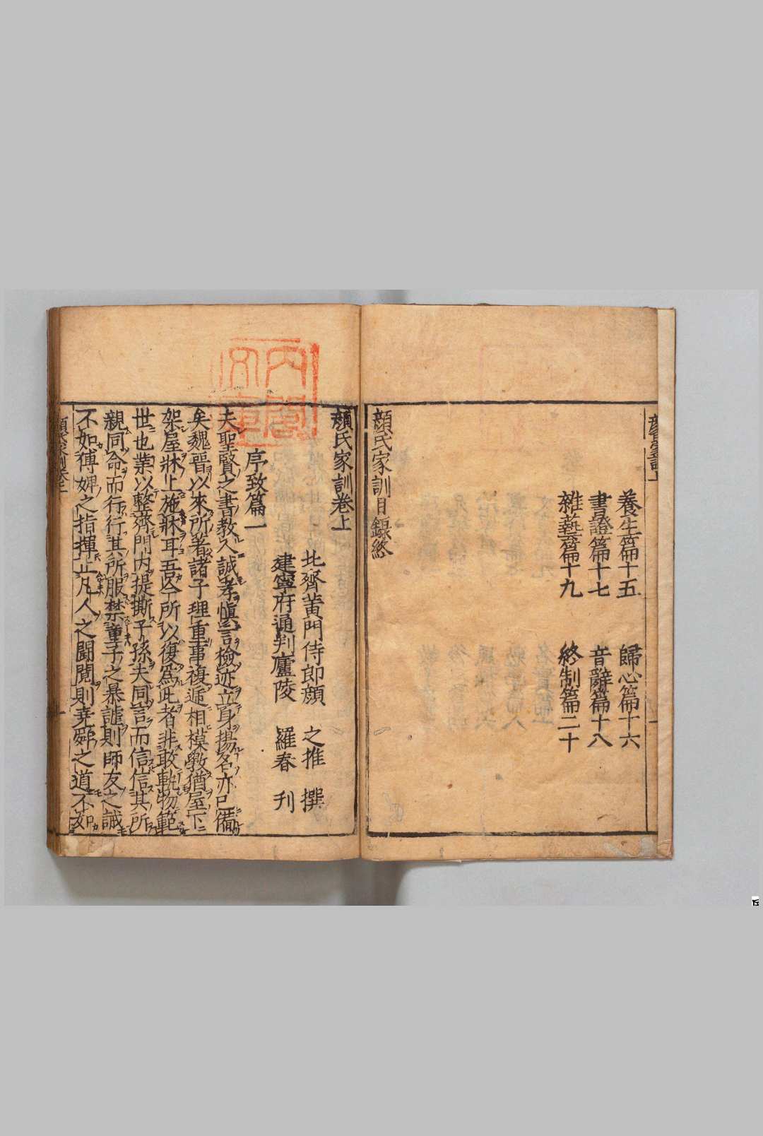 《颜氏家训》共有七卷,二十篇。分别是序致第一、教子第二、兄弟第三、后娶第四、治家第五、风操第六、慕贤第七、勉学第八、文章第九、名实第十、涉务第十一、省事第十二、止足第十三、诫兵第十四、养心第十五、归心第十六、书证第十七、音辞第十八、杂艺第十九、终制第二十。