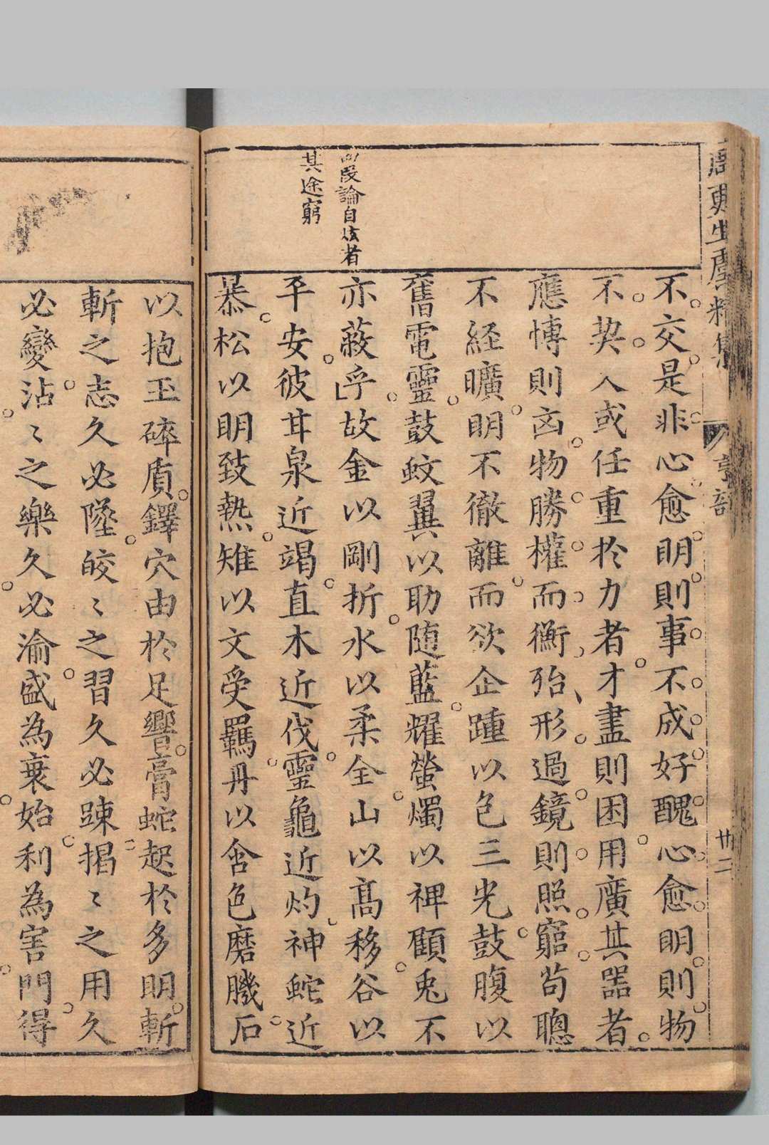 明周伯耕撰。伯耕字更生,莆田人。是书盖杂家者流。其曰虞精,盖取虞人猎百禽之精意也。前有李维祯序,称原书正续共百馀篇,莆田知县郭如闇为刻其四十七篇。此本实五十三篇,殆刻版时续入四篇,序则未改也。其书篇各立名,镕铸故事以成文,欲以博丽见长,而襞积之痕不化。盖借文以隶事,而非用事以成文,故往往堆砌拥肿,不能运掉。维祯序称其文格与陆贾《新语》、王符《潜夫论》、荀悦《申鉴》、徐干《中论》、刘劭《人物志》相似。今考其文,实与数书不类。晋、宋以后,以俪偶为子书者,惟葛洪《抱朴子》外篇,刘昼《新论》有是体裁。伯耕此书,盖规橅二家而不成耳。