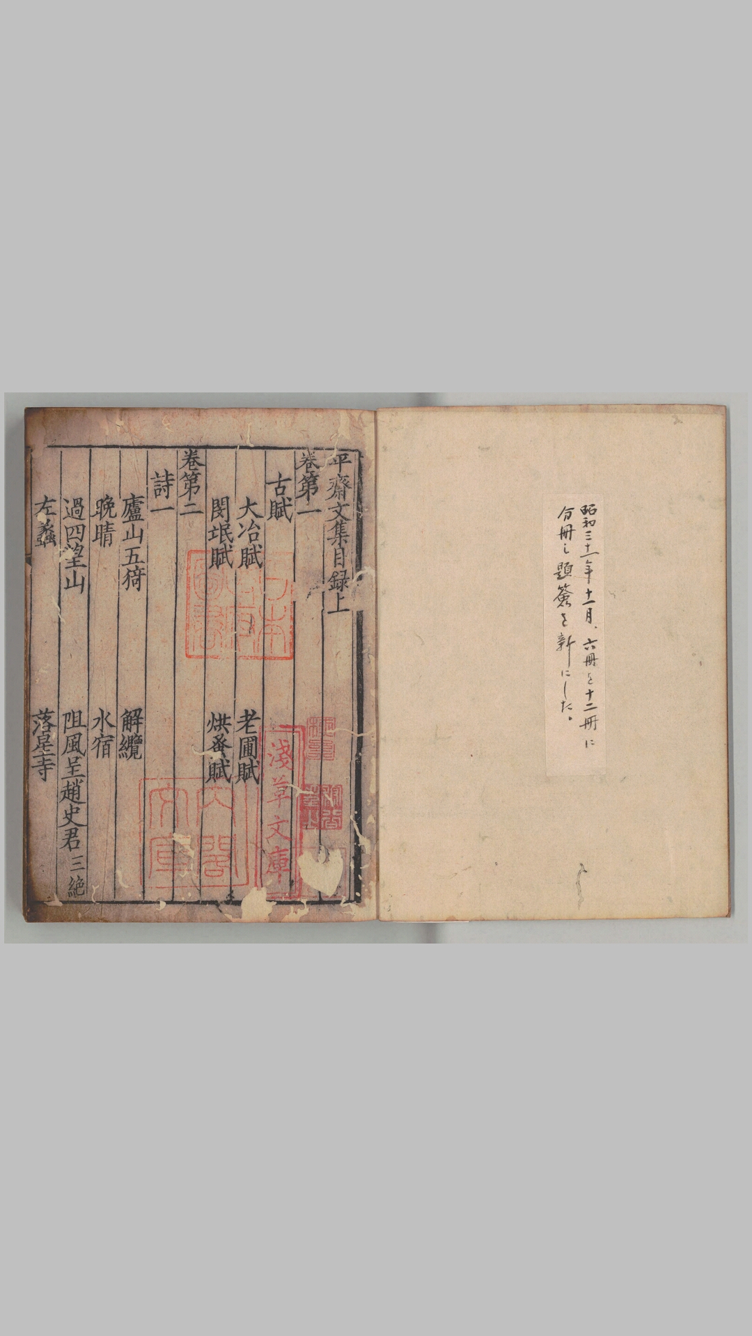 此《平斋文集》为南宋诗人洪咨夔(号平斋)的诗文别集。全书共三十二卷,所收分:古赋、诗、记、序、箴、铭、杂文、䟽、奏状、表、内外制、启、讲义、故事、策问、墓志铭、祭文等题材。此为日本内阁文库藏,南宋中期刻本。